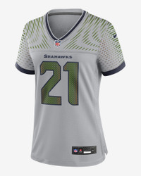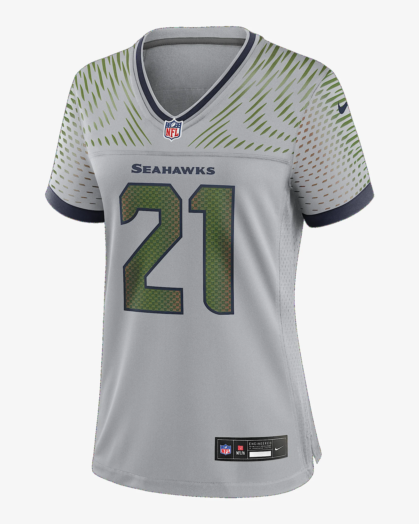 This Devon Witherspoon Rivalries Collection Jersey is inspired by the 137.6 decibels that destroy hopes, dreams and eardrums. The authentic look represents the Northwest noise levels that send opponents’ seasons south and the Seattle Seahawks soaring. Breathable mesh panels and a form fit help provide a dry, comfortable feel that's ideal for game days. Benefits - Screen-printed name, number and team mark offer lightweight durability. - Ventilation over major heat zones helps keep you cool. Product Details - Standard fit for a relaxed, easy feel - NFL shield at V-neck - Tagless neck label - Woven jock tag - Shown: Grey - Style: 67NW0G5Y78F-00S