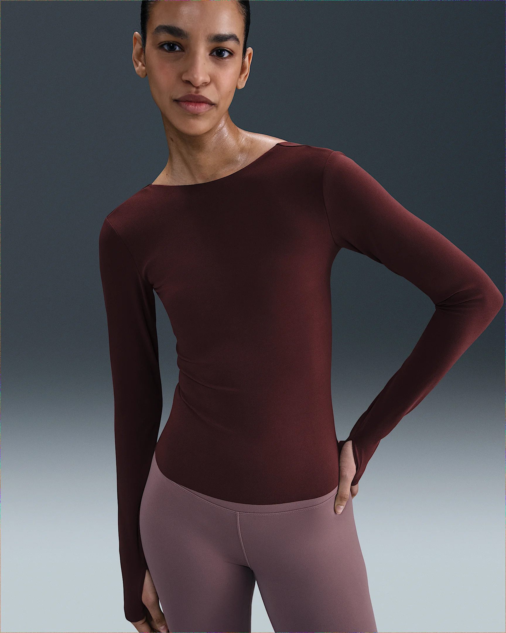 Move with total freedom in this fitted Zenvy top. It's made with InfinaSoft fabric that stretches effortlessly and offers lightweight softness. Benefits - Nike Dri-FIT technology moves sweat away from your skin for quicker evaporation, helping you stay dry and comfortable. - Thumbholes let you extend your coverage and help hold the sleeves in place while you move. - Scoop back allows extra airflow. Product Details - Raw-cut hem - Shelf bra liner - Swoosh logo at center back - Body: 63% nylon/37% spandex. Panels lining: 80% nylon/20% spandex. - Machine wash - Imported - Shown: Burgundy Crush/White - Style: HV3539-652 SIZE & FIT Model is wearing size S and is 5'10"178cm Tight fit: snug and form-fitting