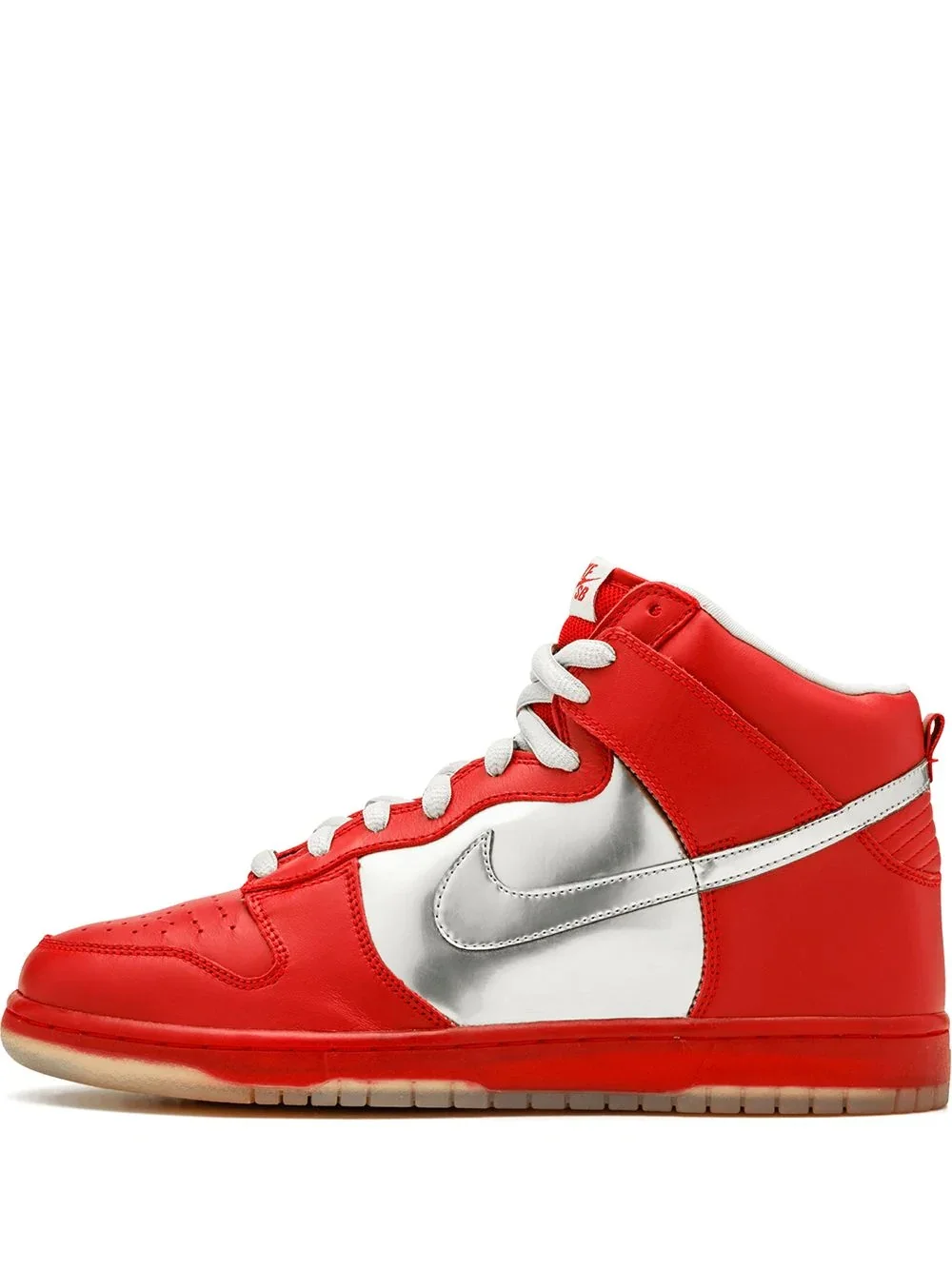 Dunk High Premium SB "Mork And Mindy" sneakers These Dunk High Premium SB sneakers are inspired by the classic TV comedy Mork and Mindy starring Robin Williams. In a chrome and vatisty red colourway this 2006 pair also feature a clear outsole. Add a bold touch. Imported Composition Outer: Leather 100% Sole: Rubber 100% Lining: Fabric 100%