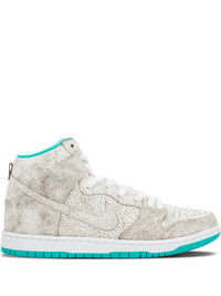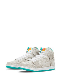 Dunk High Premium sneakers The Dunk High Premium SB 'Flamingo' features a cracked-earth effect throughout its grey upper, which is accented by a yellow and pink tongue tag. Hyper Jade brings the most prominent colour to the design, with the colour on the inner lining and outsole. A white Zoom Air midsole provides cushioning, while the insole sports a cartoon flamingo graphic, giving the shoe its name. Imported Composition Sole: Rubber 100% Outer: Leather 100% Lining: Polyester 100%