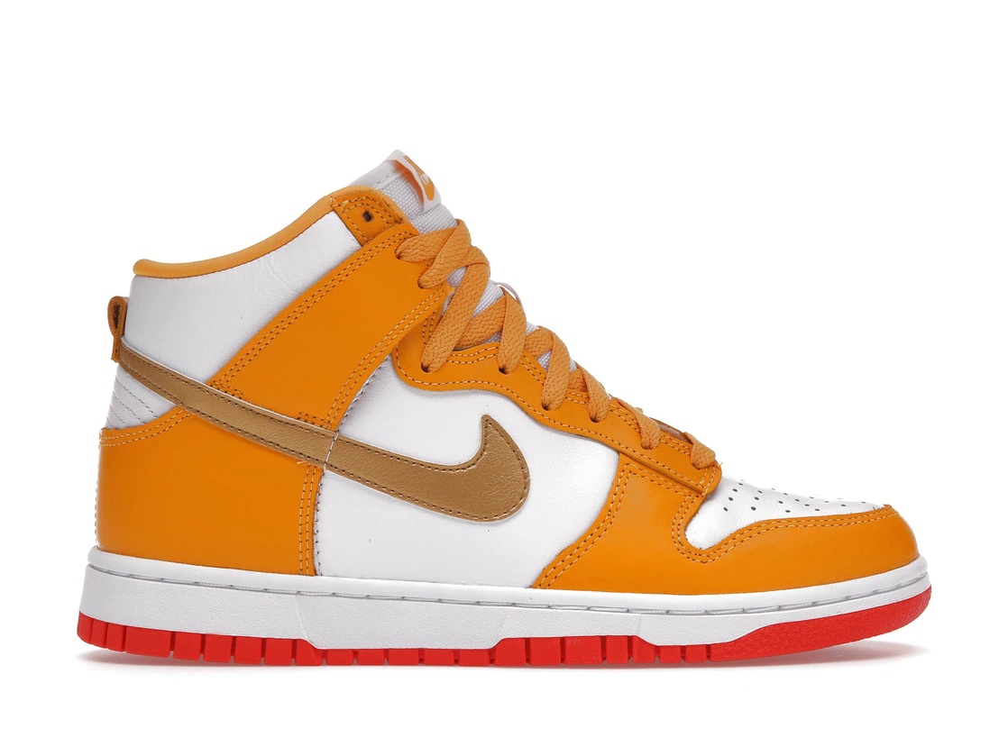 The women's Nike Dunk High University Gold (W) features a white leather upper with University gold overlays and Swooshes. From there, matching woven tongue labels and Crimson outsoles complete the design. The women's Nike Dunk High University Gold (W) released in November of 2021 and retailed for $120. - Style DQ4691-700 - Colorway University Gold/White-Crimson - Retail Price 120 - Release Date 2021-11-27 - Featured false