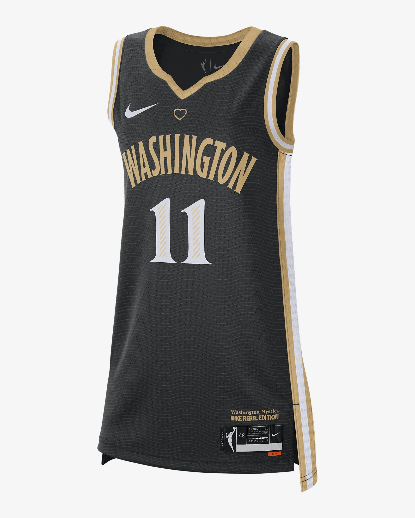 Got dreams to be the next Elena Delle Donne? The first step is looking the part. This relaxed-fit replica jersey gives you details modeled after what the Mystics wear on the court and lets you rep your favorite player everywhere you go. Benefits - Nike Dri-FIT technology moves sweat away from your skin for quicker evaporation, helping you stay dry and comfortable. - Lightweight knit fabric feels smooth against your skin. Product Details - 100% polyester - Machine wash - Imported - Shown: Black - Style: DR8400-010 SIZE & FIT Loose fit: roomy and relaxed If you typically wear women's styles, please select your usual size. If you typically wear men's styles, please size up.