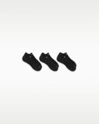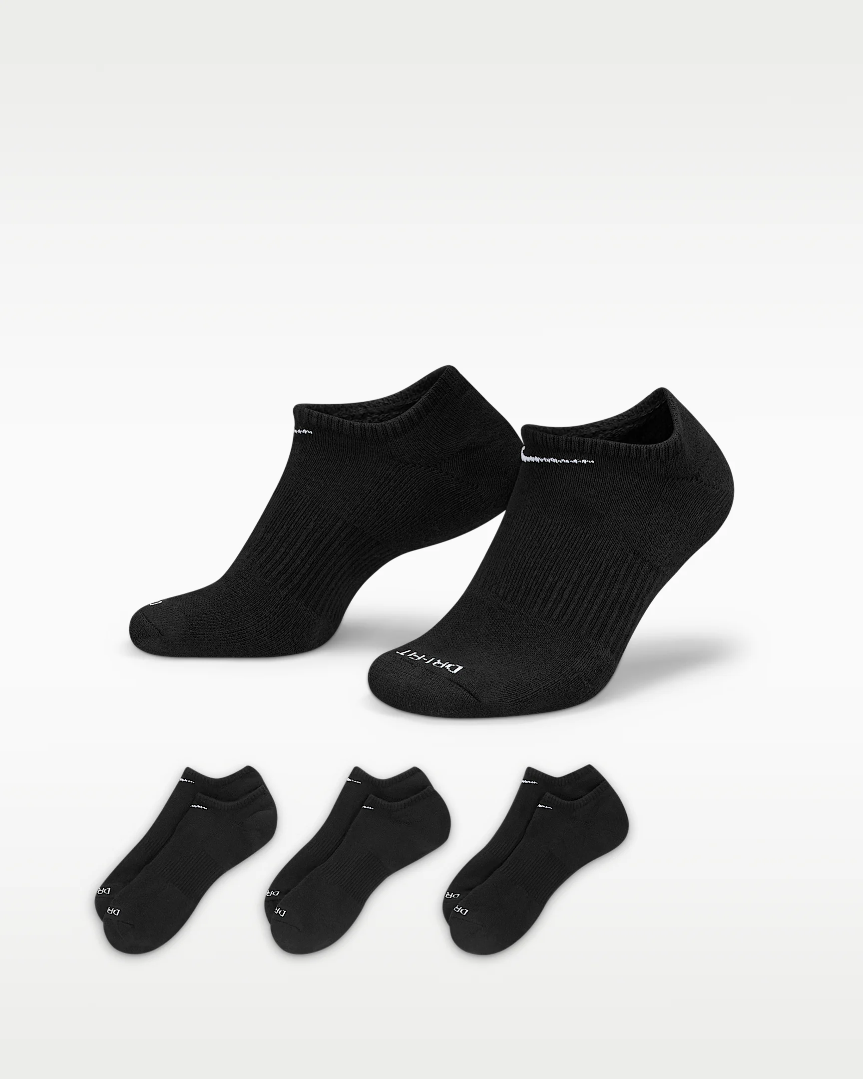 The Nike Everyday Plus Cushioned Socks bring comfort to your workout with extra cushioning under the heel and forefoot and a snug, supportive arch band. Sweat-wicking power and breathability up top help keep your feet dry and cool to help push you through that extra set. Benefits - Cushioning under the forefoot and heel helps soften the impact of your workout. - Dri-FIT technology helps your feet stay dry and comfortable. - Band around the arch feels snug and supportive. - Breathable knit pattern on top adds ventilation. - Reinforced heel and toe are made to last. Product Details - Fabric: 65-72% cotton/26-33% polyester/2% spandex - Machine wash - Imported - Note: Material percentages may vary depending on color. Check label for actual content. - Shown: Black/White - Style: SX6889-010