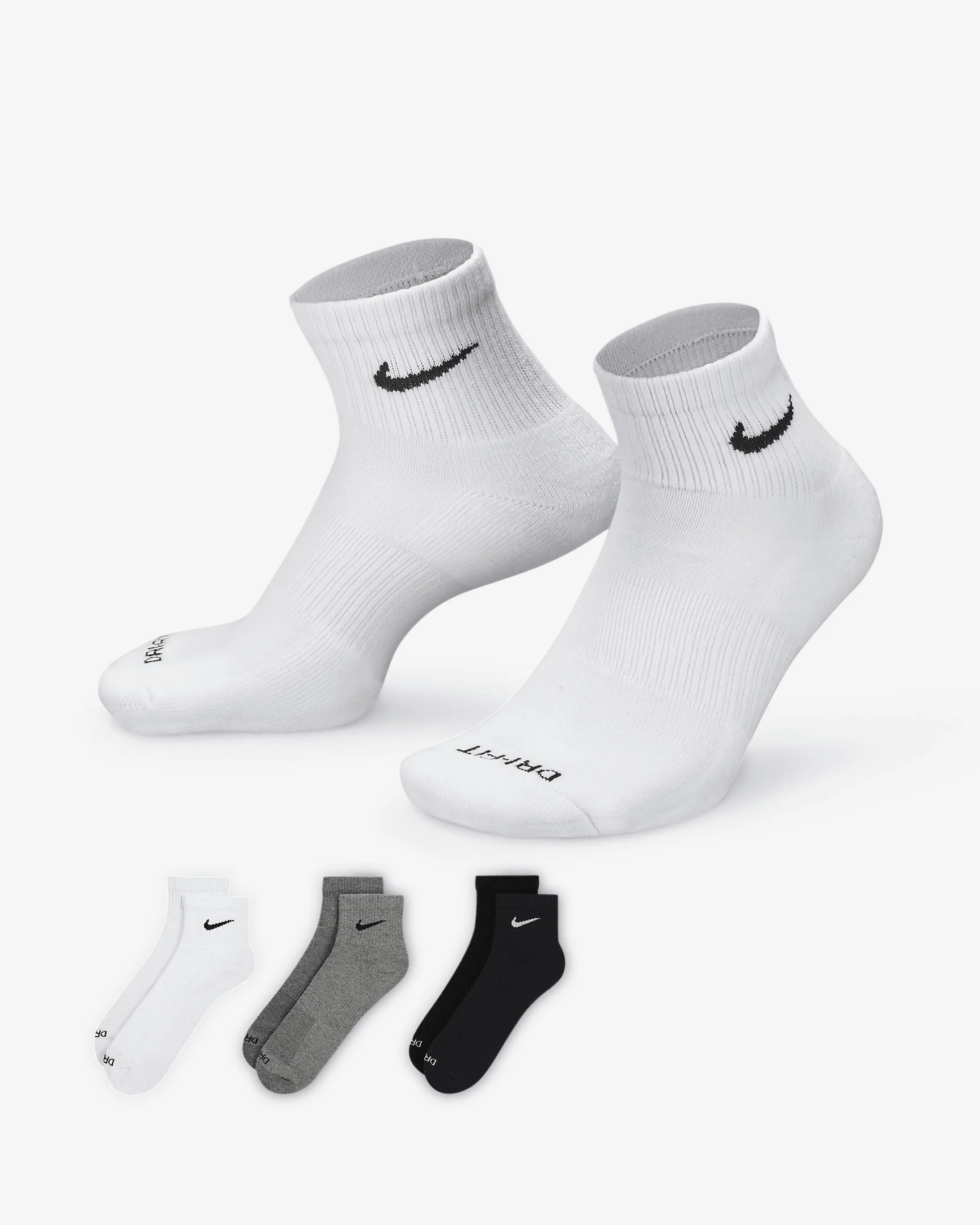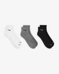 The Nike Everyday Plus Cushioned Socks bring comfort to your workout with extra cushioning under the heel and forefoot and a snug, supportive arch band. Sweat-wicking power and breathability up top help keep your feet dry and cool to help push you through that extra set. Benefits - Cushioning under the forefoot and heel helps soften the impact of your workout. - Dri-FIT technology helps your feet stay dry and comfortable. - Band around the arch feels snug and supportive. - Breathable knit pattern on top adds ventilation. - Reinforced heel and toe are made to last. Product Details - 63-70% cotton/28-35% polyester/2% polyurethane - Note: Material percentages may vary. Check label for actual content. - Machine wash - Imported - Shown: Multi-Color - Style: SX6890-965