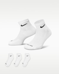 The Nike Everyday Plus Cushioned Socks bring comfort to your workout with extra cushioning under the heel and forefoot and a snug, supportive arch band. Sweat-wicking power and breathability up top help keep your feet dry and cool to help push you through that extra set. Benefits - Cushioning under the forefoot and heel helps soften the impact of your workout. - Dri-FIT technology helps your feet stay dry and comfortable. - Band around the arch feels snug and supportive. - Breathable knit pattern on top adds ventilation. - Reinforced heel and toe are made to last. Product Details - 63-70% cotton/28-35% polyester/2% polyurethane - Note: Material percentages may vary. Check label for actual content. - Machine wash - Imported - Shown: White/Black - Style: SX6890-100
