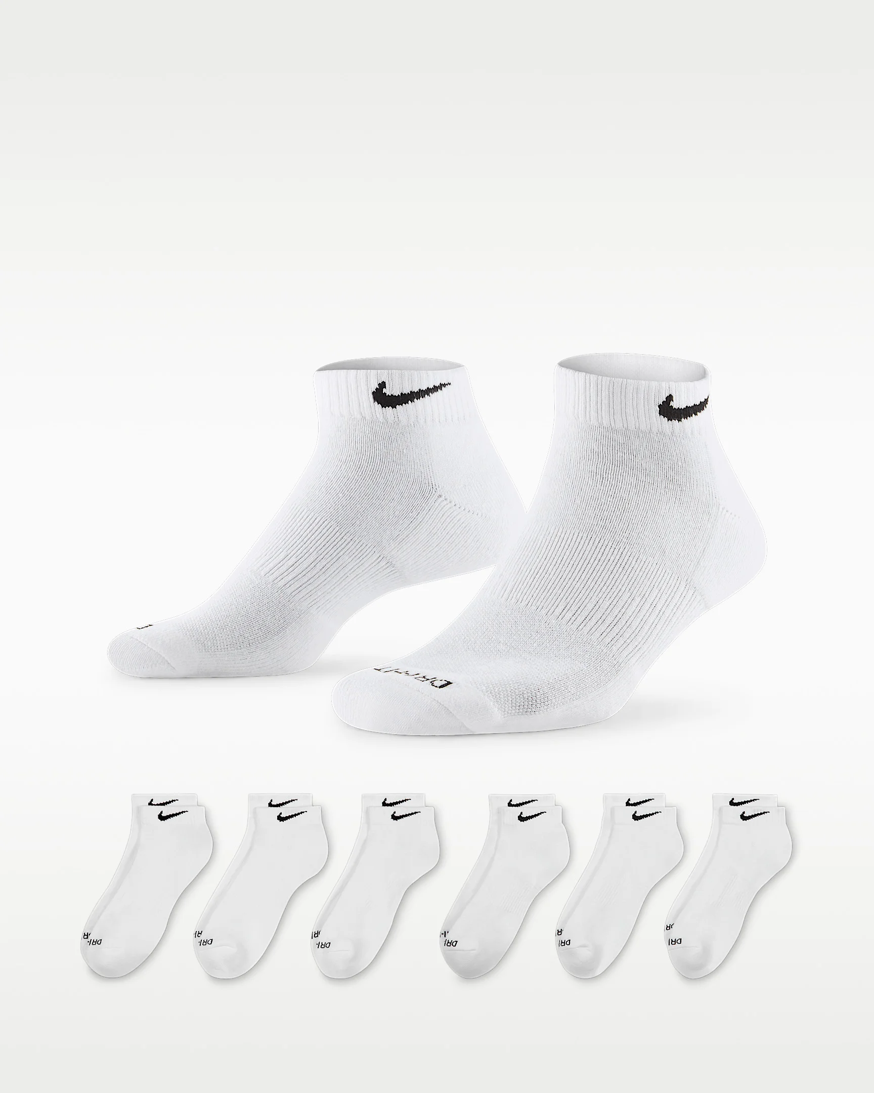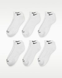 The Nike Everyday Plus Cushioned Socks bring comfort to your workout with extra cushioning under the heel and forefoot and a snug, supportive arch band. Sweat-wicking power and breathability up top help keep your feet dry and cool to help push you through that extra set. Benefits - Cushioning under the forefoot and heel helps soften the impact of your workout. - Dri-FIT technology helps your feet stay dry and comfortable. - Band around the arch feels snug and supportive. - Breathable knit pattern on top adds ventilation. - Reinforced heel and toe are made to last. Product Details - 61-68% cotton/29-36% polyester/2% spandex/1% nylon - Material percentages may vary. Check label for actual content. - Machine wash - Imported - Shown: White/Black - Style: SX7042-100