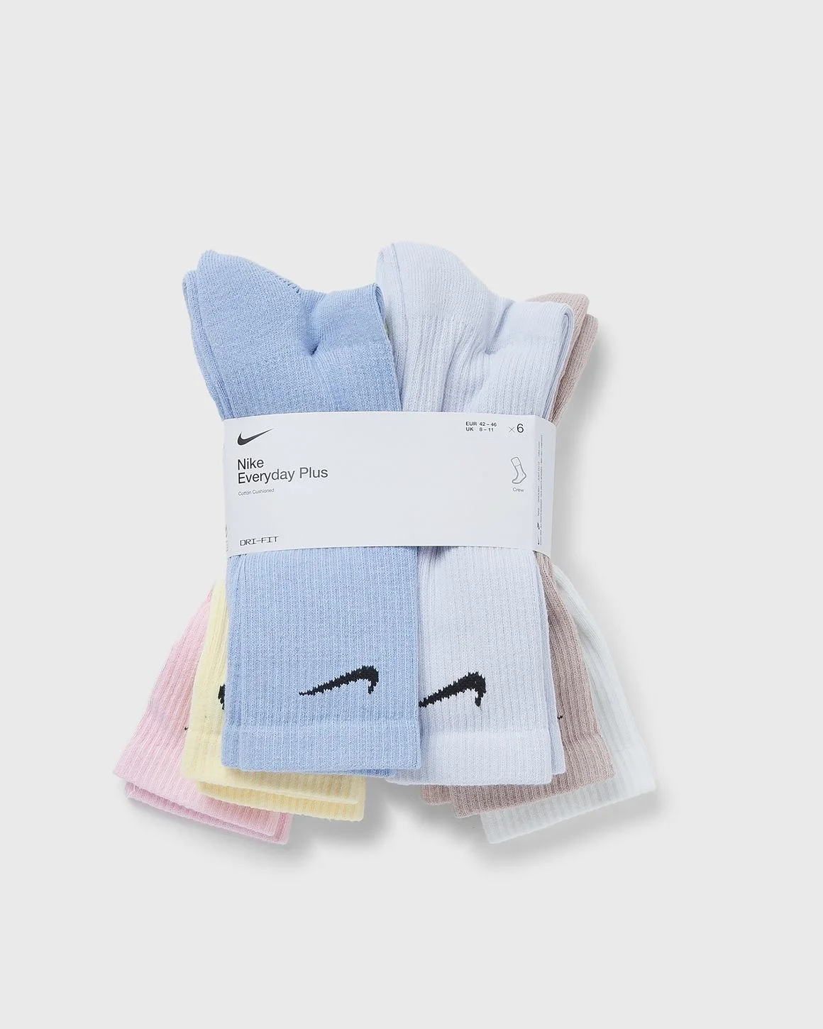 The Nike Everyday Plus Cushioned Training Crew Socks keep you comfortable during your workout with added cushioning under the heel and forefoot and a snug, supportive arch band. Dri-FIT technology provides breathability and comfort on the feet. Article Number: SX6897-906 Gender: Men, Women Color: MULTI-COLOR Material: 67% Cotton, 1% Nylon, 30% Polyester, 2% Spandex/elastane