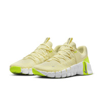 When your workouts wade into the nitty gritty, the Nike Free Metcon 5 can meet you in the depths, help you dig deep to find that final ounce of force and come out of the other side on a high. It matches style with substance, forefoot flexibility with backend stability, perfect for flying through a cardio day or enhancing your agility. A revamped upper offers easier entry with a collar made just for your ankle. Revamped Upper:A breathable, lightweight upper has a comfortable, sock-like feel with a 7/8-length inner sleeve and provides easy entry. Plush foam around the collar provides comfort and support around your ankle. Stability for Strength:The wide heel creates a solid base for lifting. A softer foam core cushions your foot, while a firmer outer layer is durable and stable. Wide internal webbing distributes pressure around your midfoot for a comfortable yet secure feel during sudden stops and quick cuts. Move Freely:Nike Free technology in the forefoot creates flexibility for agility moves like burpees, planks and sprints. Stretch around the collar lets your foot move naturally as you burst, cut and brake. More Benefits:Molded heel clip offers support. Webbing eyelets give you a snug, secure fit while also flexing with each step. Rubber tread in high-wear areas gives you durable traction. Product Details:Not intended for use as Personal Protective Equipment (PPE). Style: DV3950; Color: Citron Tint/Volt/Summit White/Cool Grey; Size: 7.5; Gender: Female; Age Group: Adult | Nike Free Metcon 5 Women's Workout Shoes in Yellow, Size: 7.5 | DV3950-800