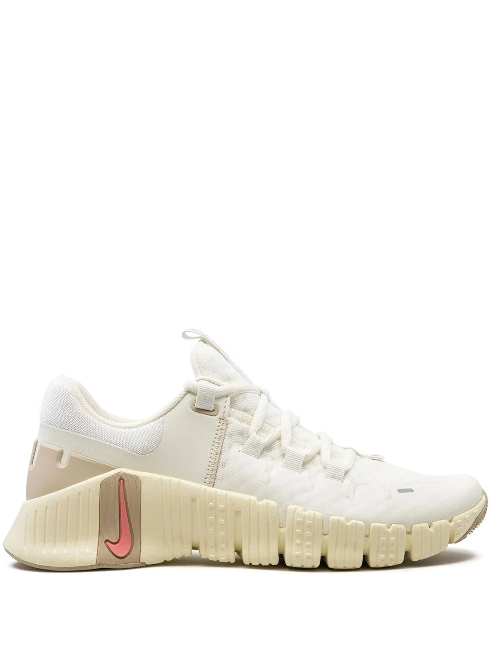 Free Metcon 5 "Sail/Sanddrift" sneakers Highlights - White/ivory white/beige - Signature swoosh logo detail - Reflective detailing - Logo at the sole - Round toe - Front lace-up fastening - Pull-tab at the tongue - Branded insole - Rubber sole - These styles are supplied by a premium and authenticated sneaker marketplace. stocking only the most sought-after footwear, they source and curate some of the most hard to find sneakers from around the world. Imported Composition Sole: Rubber 100% Outer: Fabric 100% Lining: Fabric 100%