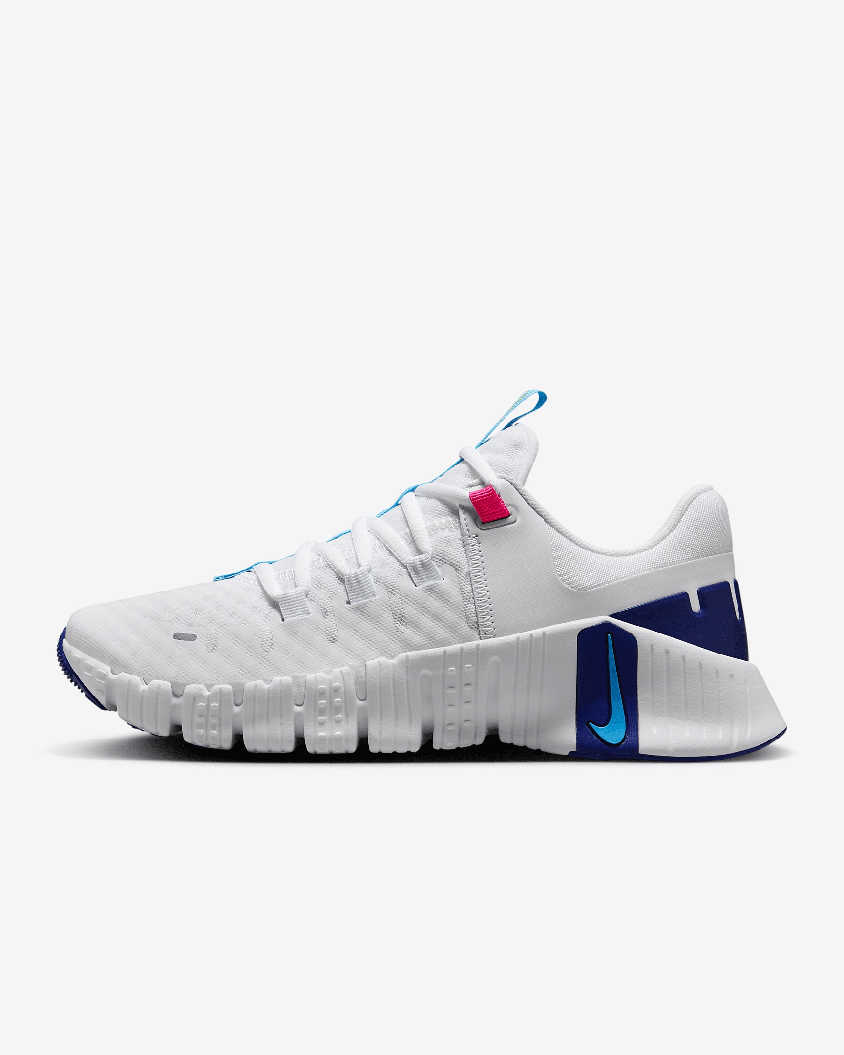 When your workouts wade into the nitty gritty, the Nike Free Metcon 5 can meet you in the depths, help you dig deep to find that final ounce of force and come out of the other side on a high. It matches style with substance, forefoot flexibility with backend stability, perfect for flying through a cardio day or enhancing your agility. A revamped upper offers easier entry with a collar made just for your ankle. More Benefits - Molded heel clip offers support. - Webbing eyelets give you a snug, secure fit while also flexing with each step. - Rubber tread in high-wear areas gives you durable traction. Product Details - Not intended for use as Personal Protective Equipment (PPE) - Shown: White/Fierce Pink/Deep Royal Blue/Aquarius Blue - Style: DV3950-103