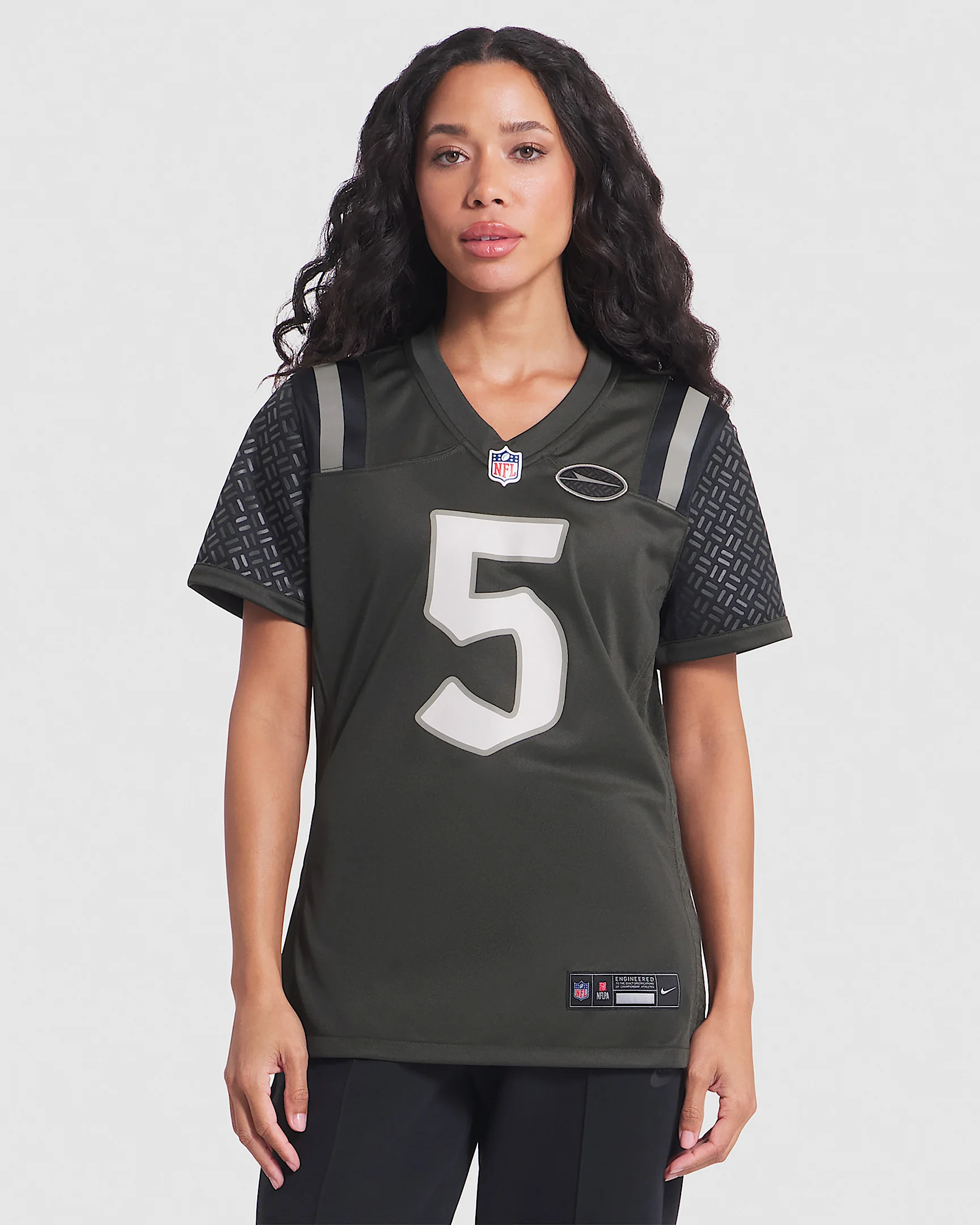 This Garrett Wilson Rivalries Collection Jersey puts the grit of Gotham City Football on full display. The authentic look features a dark green backdrop with black accents representing the late nights and long shadows in the city that never sleeps. Breathable mesh panels and a form fit help provide a dry, comfortable feel that's ideal for game days. Benefits - Screen-printed name, number and team mark offer lightweight durability. - Ventilation over major heat zones helps keep you cool. Product Details - Standard fit for a relaxed, easy feel - NFL shield at V-neck - Tagless neck label - Woven jock tag - Shown: Green - Style: 67NW0G6672F-GTF