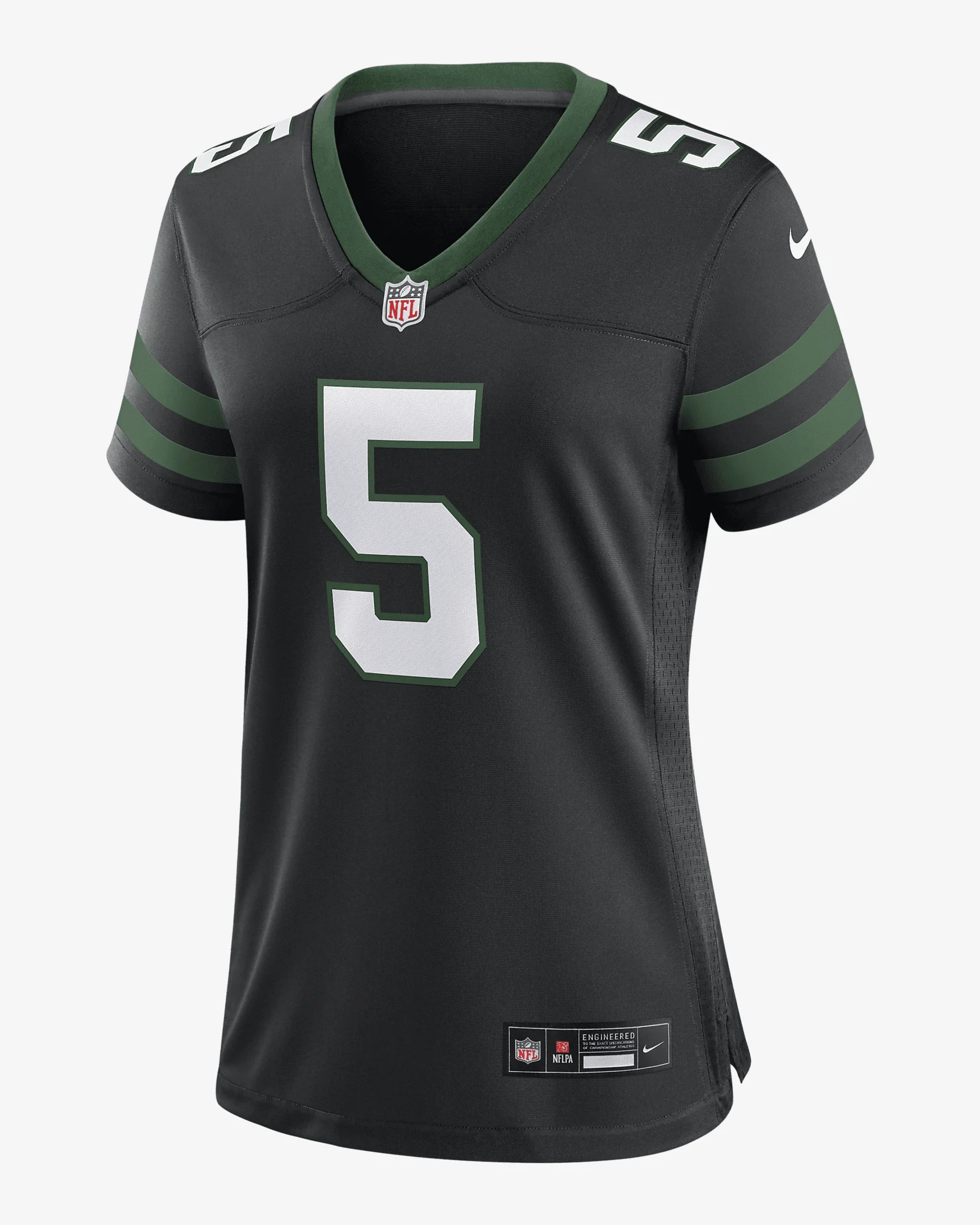 Rep one of your team's top stars with this New York Jets Jersey. Proper ventilation and a form fit help provide a dry, comfortable wear with the authentic look of the on-field uniform. Benefits - Screen-printed name, number and team mark offer lightweight durability. - Ventilation over major heat zones helps keep you cool. Product Details - Standard fit for a relaxed, easy feel - NFL shield at V-neck - Tagless neck label - Woven jock tag - 100% polyester - Machine wash - Imported - Shown: Black - Style: 67NW09WK72F-GTF