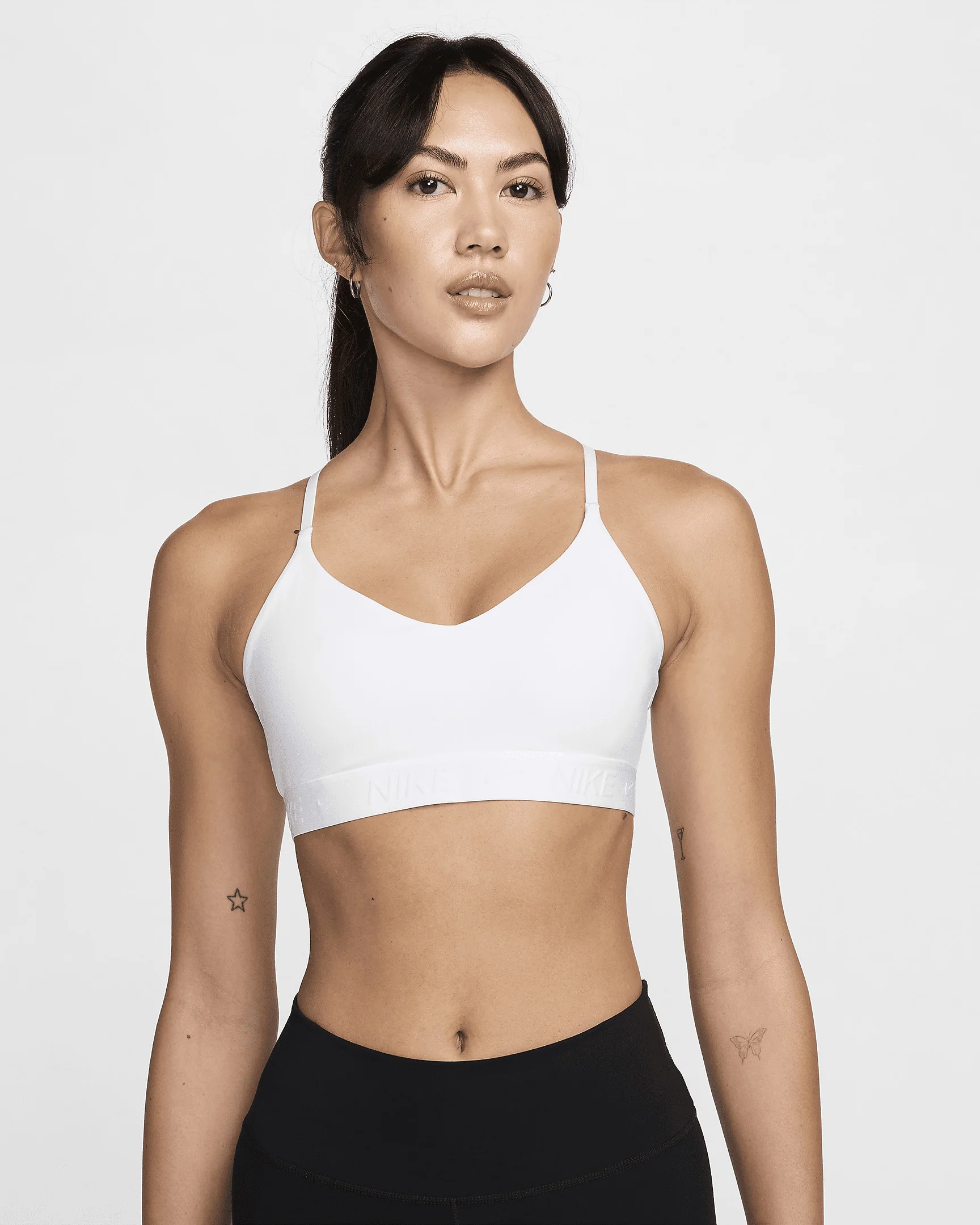 Don't let anything get in the way of expressing yourself in this sleek, low-profile sports bra. Its light support gives you a gentle hold with plenty of freedom that's great for low-impact workouts or all-day comfort. Smooth, quick-drying fabric gives the bra a clean finish so you can wear it your way. More Benefits - Nike Dri-FIT technology moves sweat away from your skin for quicker evaporation, helping you stay dry and comfortable. - Soft jacquard chest band sits snugly against your skin without pinching or binding. Product Details - Body: 78-79% polyester/21-22% spandex. Bottom hem: 53% polyester/28% nylon/19% spandex. Straps: 52% polyester/32% spandex/16% nylon. Lining: 84% polyester/16% spandex. Interlining: 80% polyester/20% spandex. Pad top fabric/Pad back fabric: 100% polyester. Pad: 100% polyurethane. - Machine wash - Imported - Shown: White/Stone Mauve - Style: FD1062-100 SIZE & FIT Model is wearing size S Model height: 5′9″175cm Model bust: 31″79cm Tight fit: snug and form-fitting Light support: feels ke a soft hug with plenty of freedom