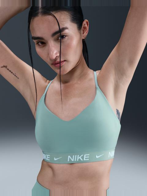 Don't let anything get in the way of expressing yourself in this sleek, low-profile sports bra. Its light support gives you a gentle hold with plenty of freedom that's great for low-impact workouts or all-day comfort. Smooth, quick-drying fabric gives the bra a clean finish so you can wear it your way. More Benefits - Nike Dri-FIT technology moves sweat away from your skin for quicker evaporation, helping you stay dry and comfortable. - Soft jacquard chest band sits snugly against your skin without pinching or binding. Product Details - Body: 78-79% polyester/21-22% spandex. Bottom hem: 53% polyester/28% nylon/19% spandex. Straps: 52% polyester/32% spandex/16% nylon. Lining: 84% polyester/16% spandex. Interlining: 80% polyester/20% spandex. Pad top fabric/Pad back fabric: 100% polyester. Pad: 100% polyurethane. - Machine wash - Imported - Shown: Black/Black/Black - Style: FD1062-010 SIZE & FIT Model is wearing size S Model height: 5′9″175cm Model bust: 31″79cm Tight fit: snug and form-fitting Light support: feels ke a soft hug with plenty of freedom