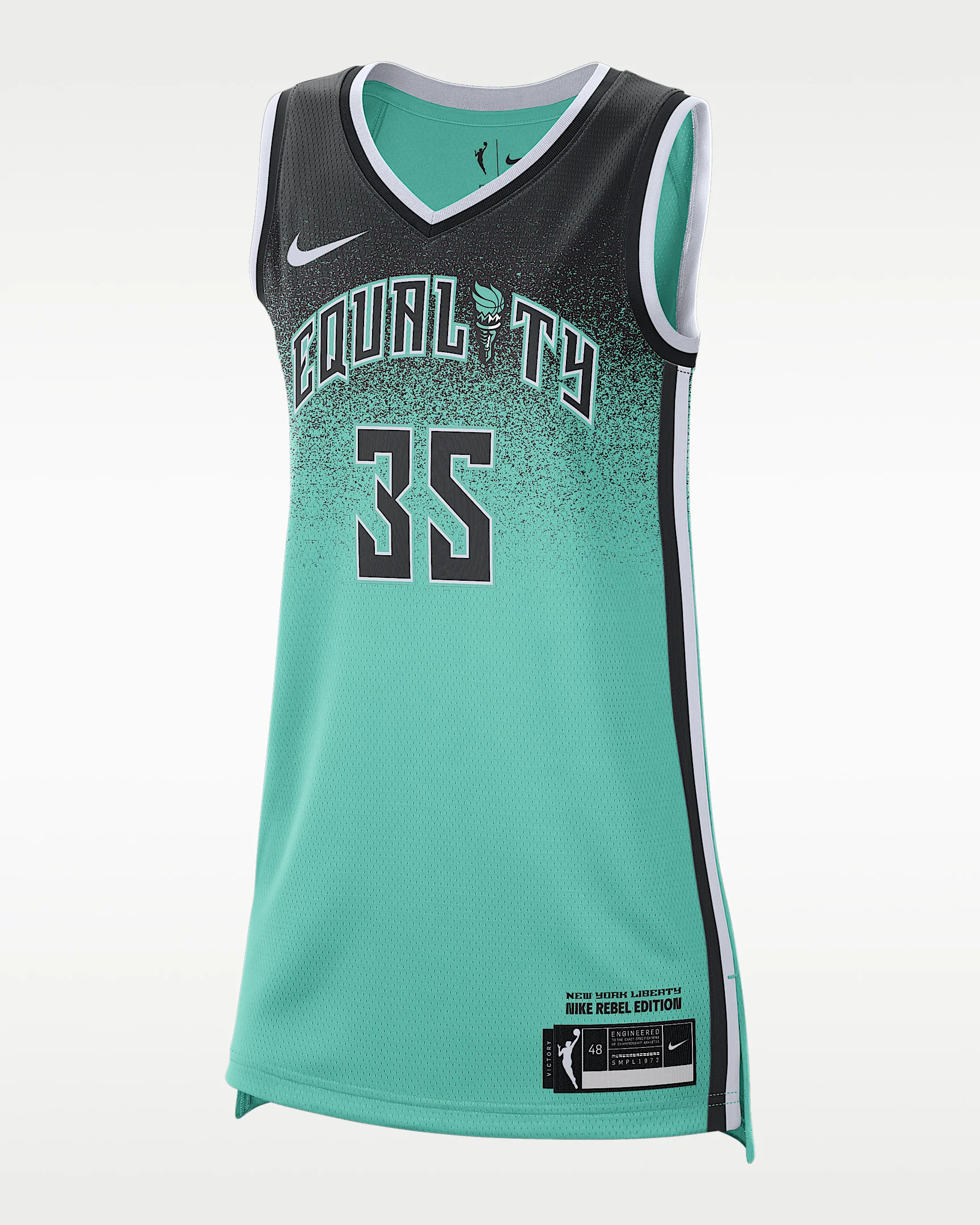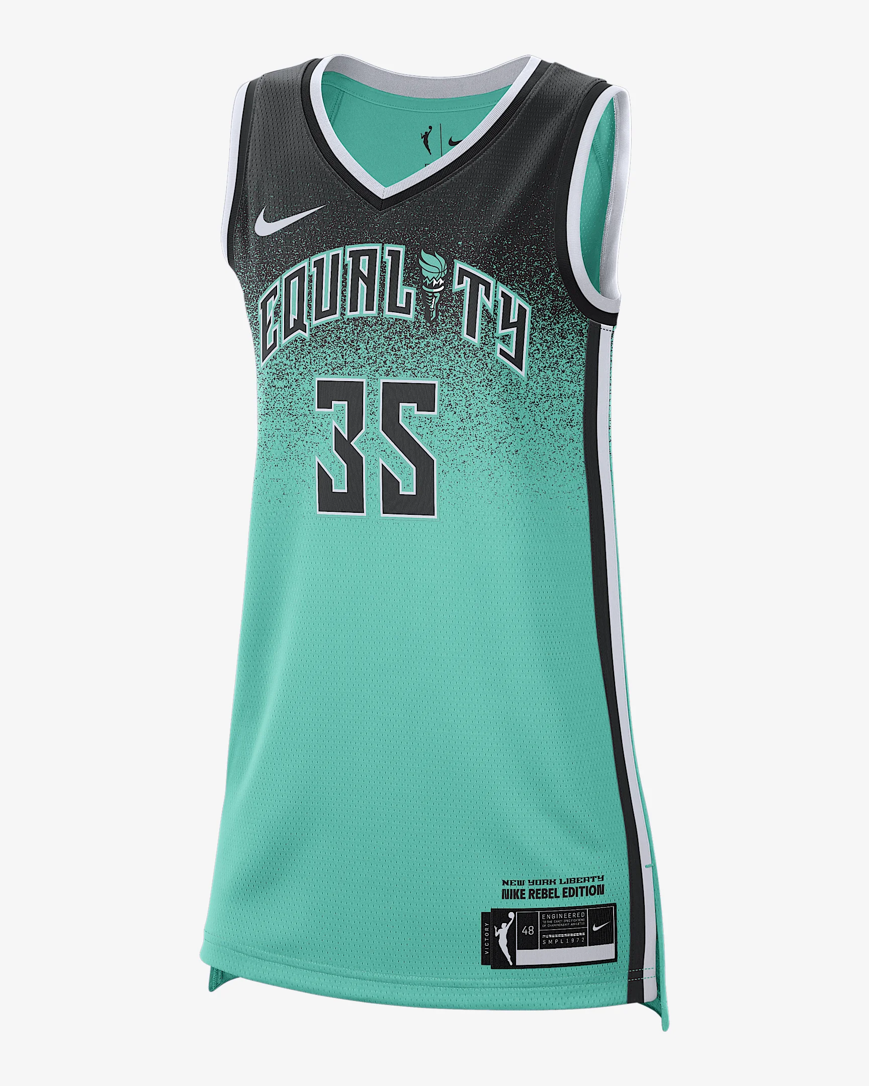 Got dreams to be the next Jonquel Jones? The first step is looking the part. This relaxed-fit replica jersey gives you details modeled after what the Liberty wear on the court and lets you rep your favorite player everywhere you go. Benefits - Nike Dri-FIT technology moves sweat away from your skin for quicker evaporation, helping you stay dry and comfortable. - Lightweight knit fabric feels smooth against your skin. Product Details - 100% polyester - Machine wash - Imported - Shown: Mint - Style: FD0806-308 SIZE & FIT Loose fit: roomy and relaxed If you typically wear women's styles, please select your usual size. If you typically wear men's styles, please size up.