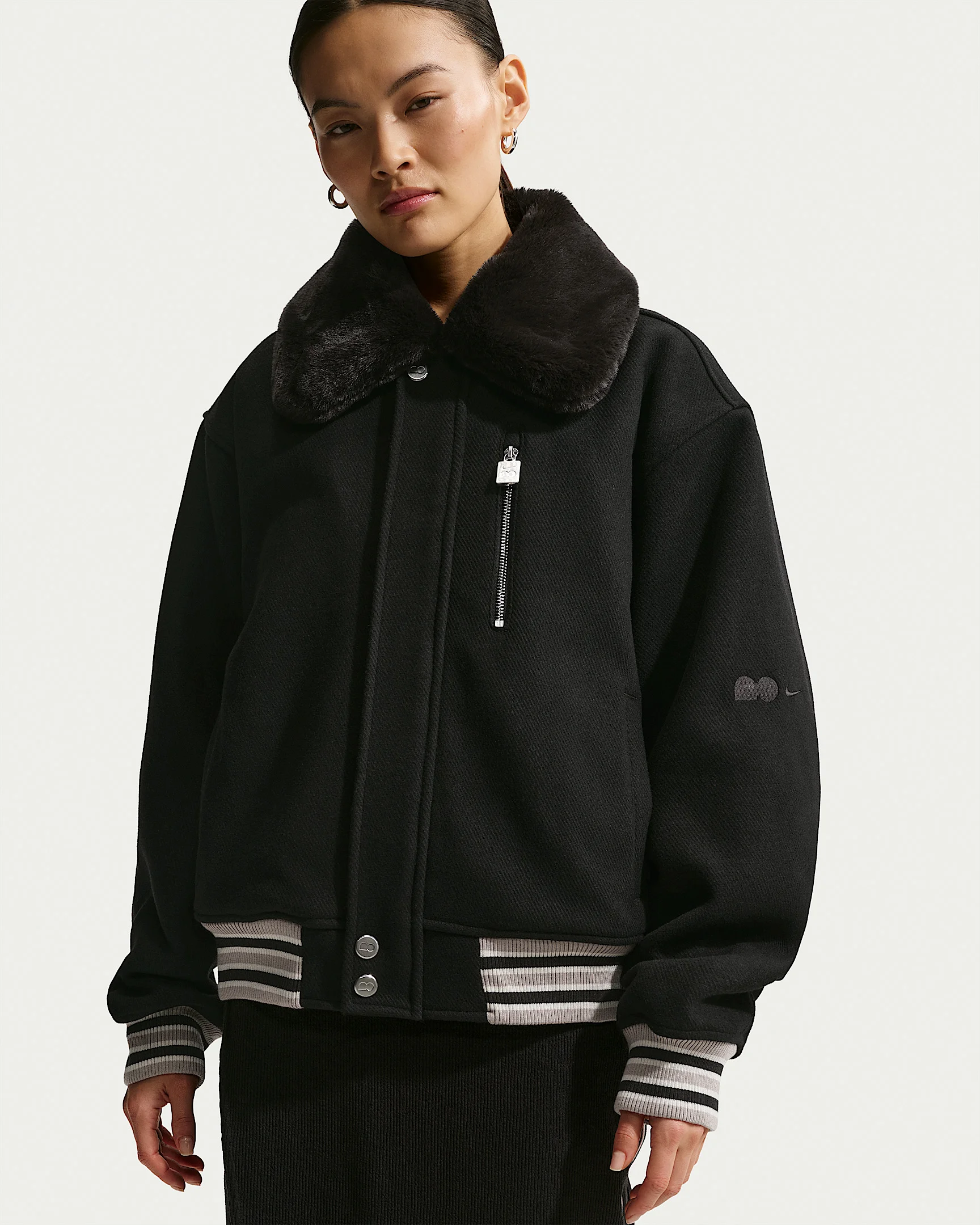 We designed this jacket in collaboration with Naomi Osaka as a nod to varsity sport styles. It has an oversized fit for a casual look and easy layering. The plush faux-fur collar adds dimension and the wool-blend fabric helps keep you warm. Benefits - Thermal fabric helps manage your body’s natural heat to help keep you warm in cold-weather conditions. - Lock detail on zipper pull references the key Naomi received from her father's Haitian hometown. Product Details - Body: 54% wool (recycled)/46% polyester. Rib: 97% polyester/3% spandex. Faux fur/Lining: 100% polyester. - Ribbed cuffs and hem - Zipper and snap closure - Locker loop - Do not wash - Imported - Shown: Black/Malt/Black - Style: HV2058-010 SIZE & FIT Model is wearing size S and is 5′7″170cm Oversized fit: exaggerated and spacious