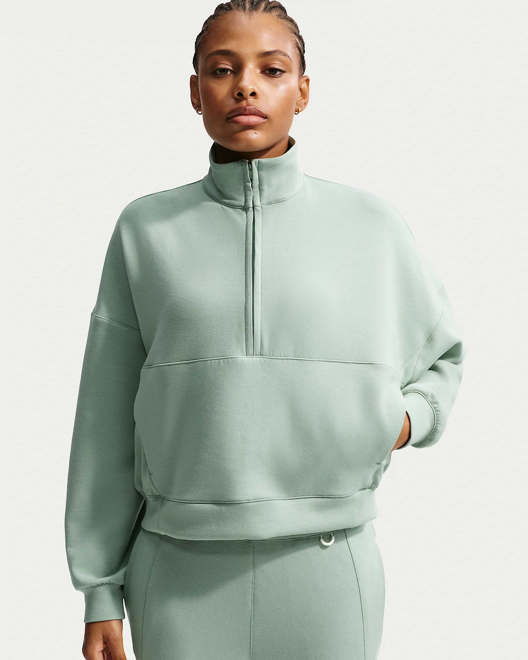 Extraordinarily soft and smooth, our ImpossiblySoft fabric feels made for all-day motion. It's a double-knit material that adds structure to this top while wicking sweat—for comfort that doesn't quit. Benefits - Nike Dri-FIT technology moves sweat away from your skin for quicker evaporation, helping you stay dry and comfortable. - Open front pocket holds your essentials. Product Details - 1/2-length zipper with thin molded pull - Signature locker loop at back of neck - Matte silicone branding on left sleeve - Body: 51% polyester/25% modal/15% cotton/9% spandex. Pocket lining: 100% cotton. - Machine wash - Imported - Shown: Steam/Mineral Slate - Style: HQ8188-006 SIZE & FIT Model is wearing size S and is 5′11″179cm Oversized fit: exaggerated and spacious Fits large; we recommend ordering a size down