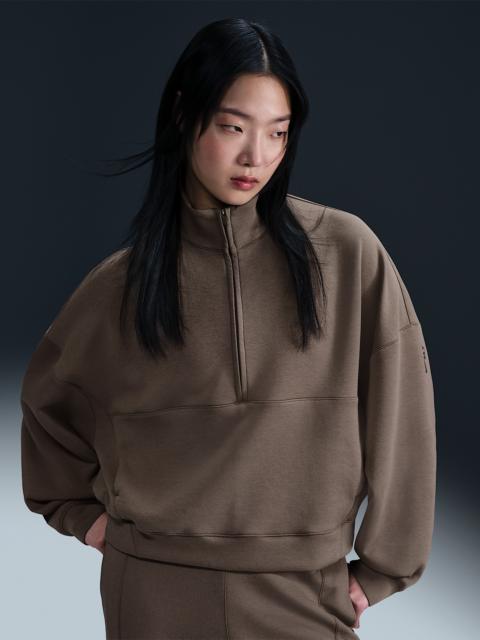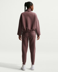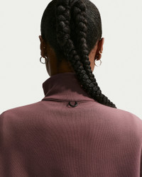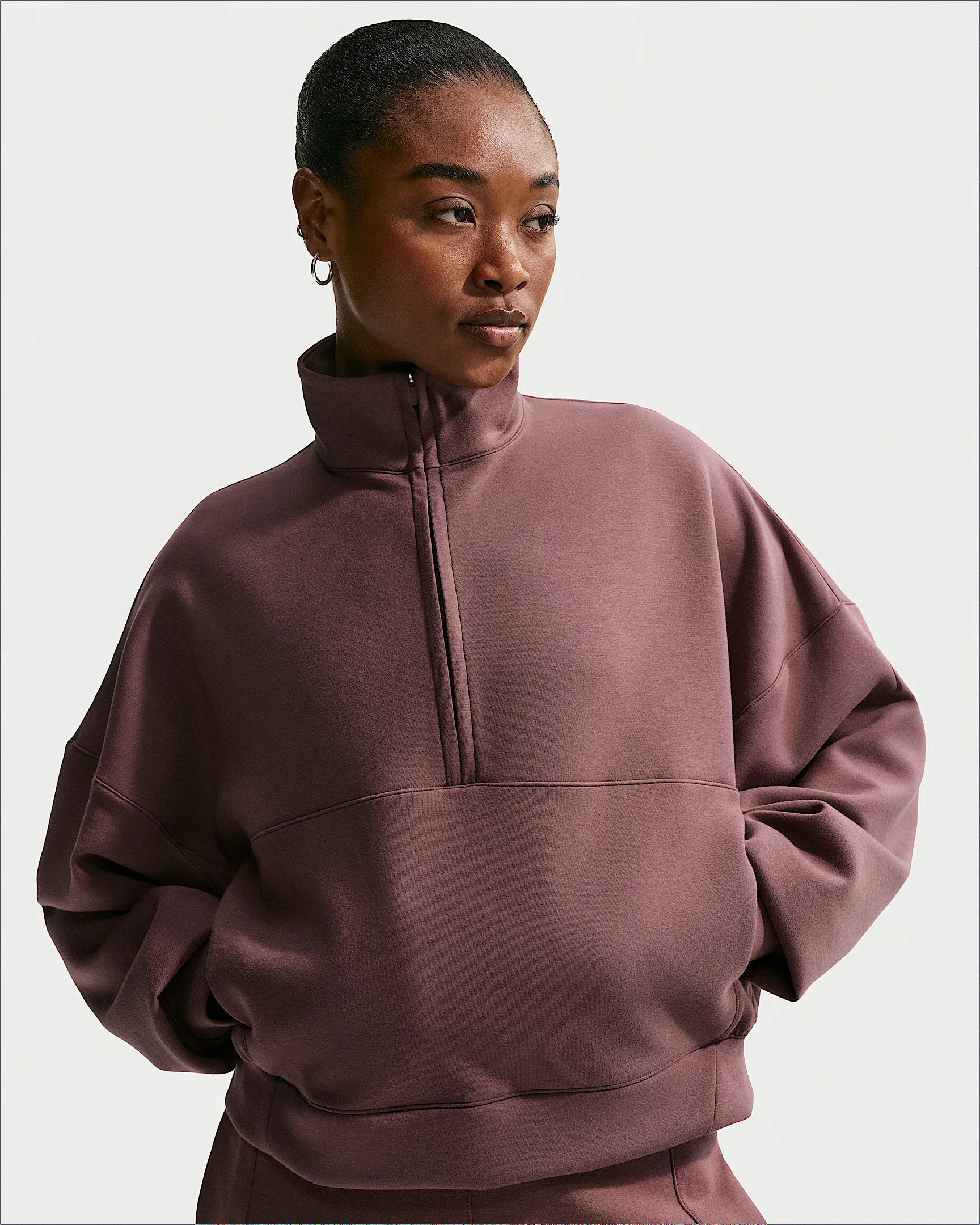 Extraordinarily soft and smooth, our ImpossiblySoft fabric feels made for all-day motion. It's a double-knit material that adds structure to this top while wicking sweat—for comfort that doesn't quit. Benefits - Nike Dri-FIT technology moves sweat away from your skin for quicker evaporation, helping you stay dry and comfortable. - Open front pocket holds your essentials. Product Details - 1/2-length zipper with thin molded pull - Signature locker loop at back of neck - Matte silicone branding on left sleeve - Body: 51% polyester/25% modal/15% cotton/9% spandex. Pocket lining: 100% cotton. - Machine wash - Imported - Shown: Tattoo/Burgundy Crush - Style: HQ8188-502 SIZE & FIT Model is wearing size S and is 5′8″173cm Oversized fit: exaggerated and spacious Fits large; we recommend ordering a size down