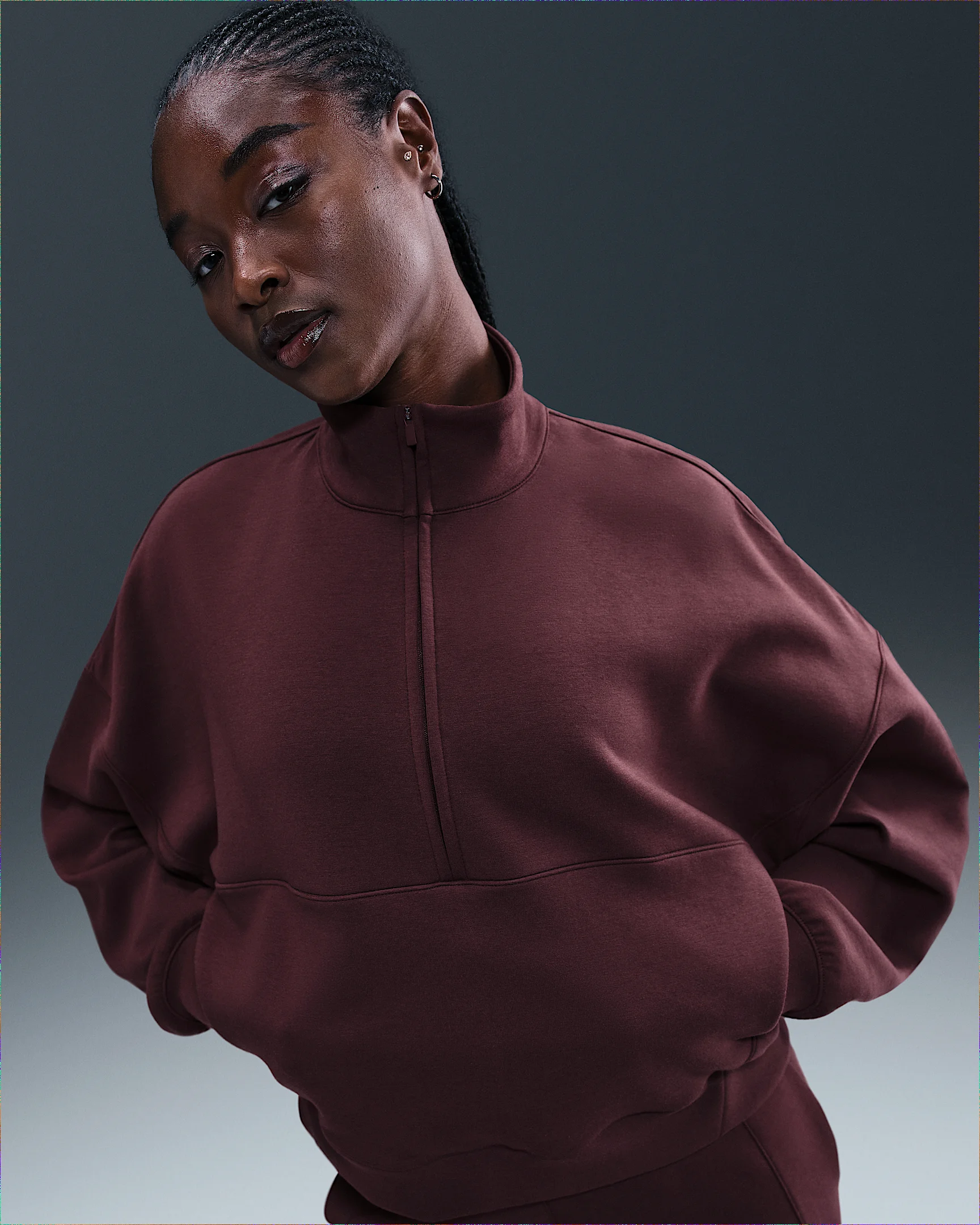 Extraordinarily soft and smooth, our ImpossiblySoft fabric feels made for all-day motion. It's a double-knit material that adds structure to this top while wicking sweat—for comfort that doesn't quit. Benefits - Nike Dri-FIT technology moves sweat away from your skin for quicker evaporation, helping you stay dry and comfortable. - Open front pocket holds your essentials. Product Details - 1/2-length zipper with thin molded pull - Signature locker loop at back of neck - Matte silicone branding on left sleeve - Body: 51% polyester/25% modal/15% cotton/9% spandex. Pocket lining: 100% cotton. - Machine wash - Imported - Shown: Burgundy Crush/Burgundy Ash - Style: HQ8188-652 SIZE & FIT Oversized fit: exaggerated and spacious Fits large; we recommend ordering a size down