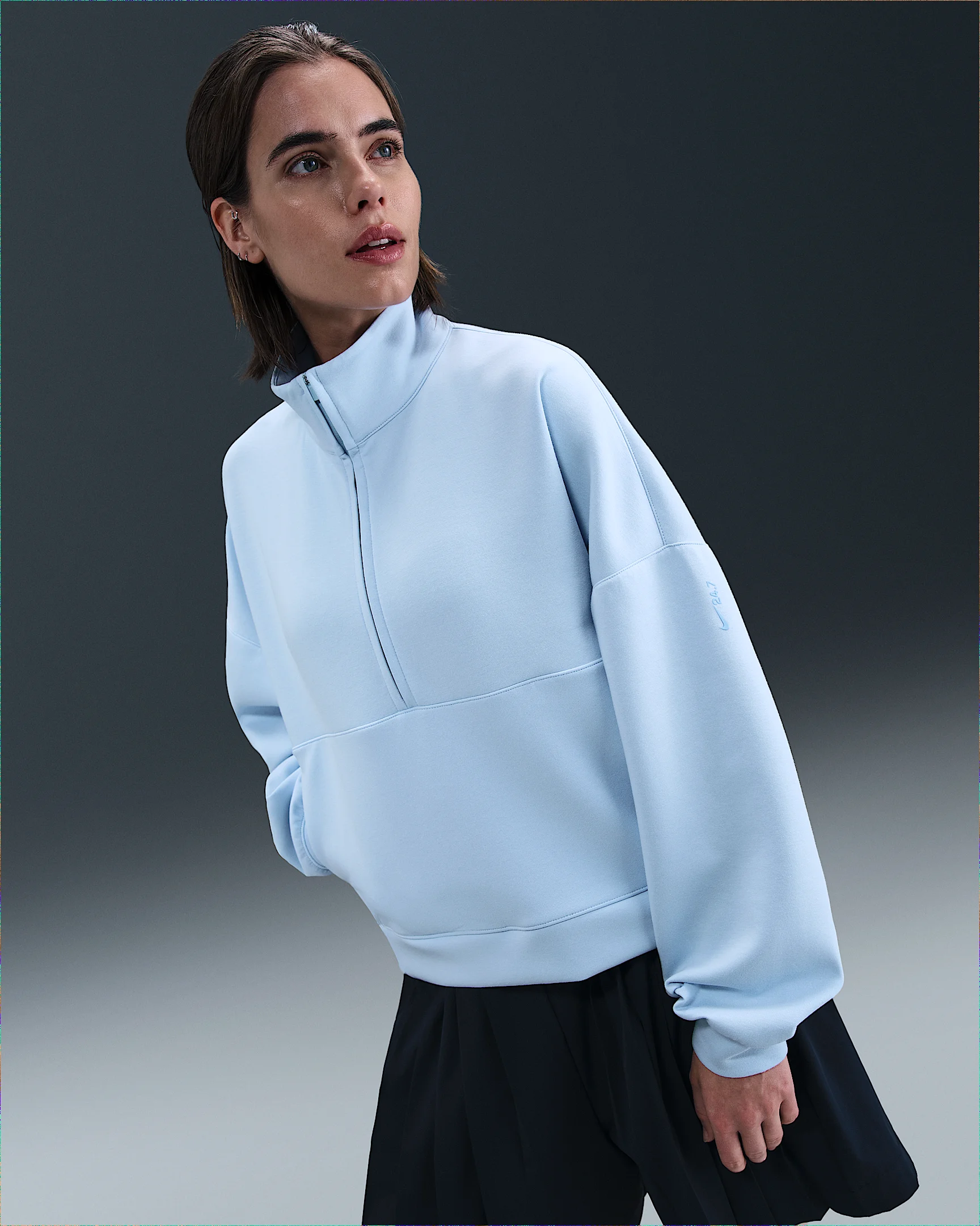 Extraordinarily soft and smooth, our ImpossiblySoft fabric feels made for all-day motion. It's a double-knit material that adds structure to this top while wicking sweat—for comfort that doesn't quit. Benefits - Nike Dri-FIT technology moves sweat away from your skin for quicker evaporation, helping you stay dry and comfortable. - Open front pocket holds your essentials. Product Details - 1/2-length zipper with thin molded pull - Signature locker loop at back of neck - Matte silicone branding on left sleeve - Body: 51% polyester/25% modal/15% cotton/9% spandex. Pocket lining: 100% cotton. - Machine wash - Imported - Shown: Celestine Blue/Psychic Blue - Style: HQ8188-441 SIZE & FIT Model is wearing size S and is 5′9″175cm Oversized fit: exaggerated and spacious Fits large; we recommend ordering a size down