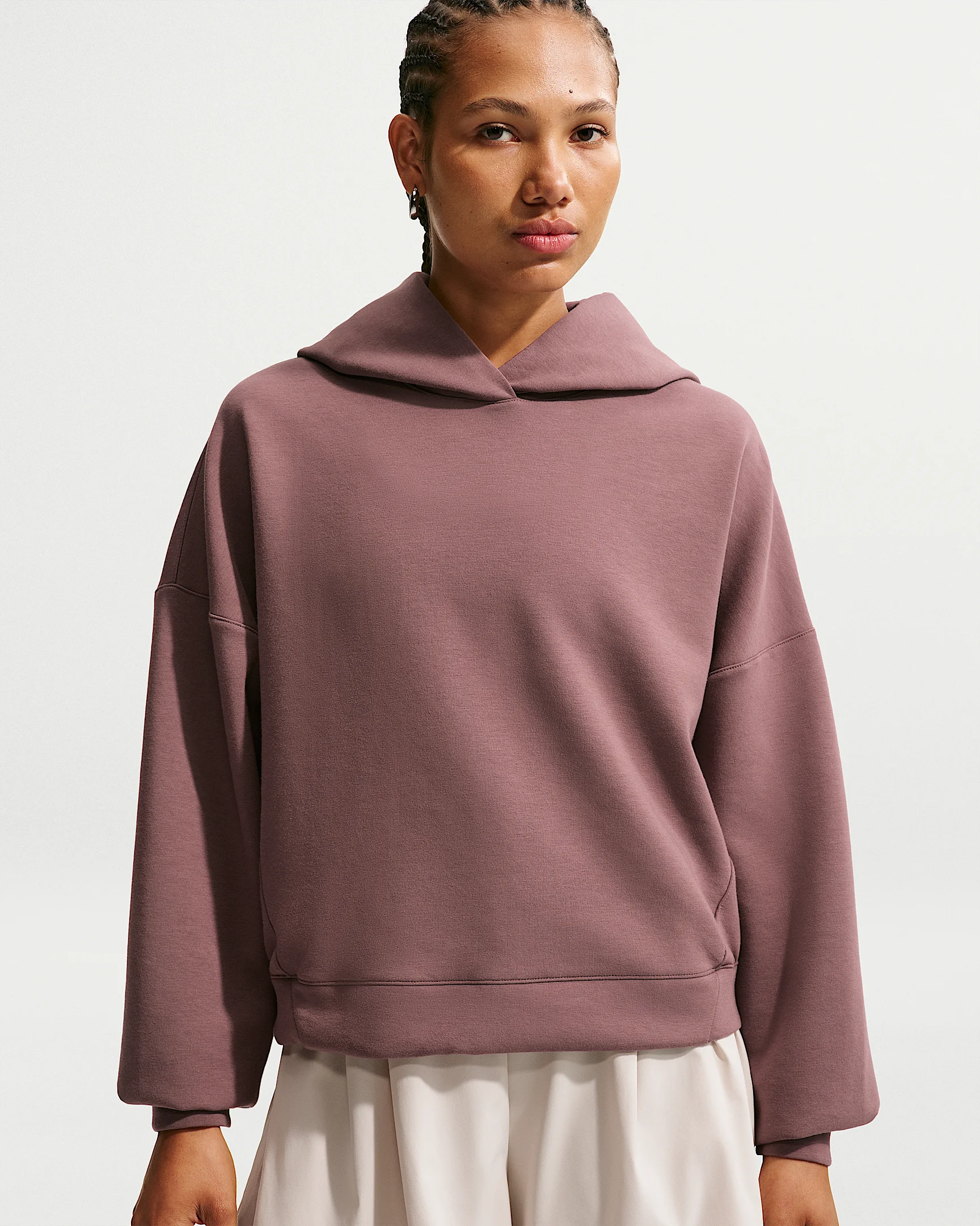 Extraordinarily soft and smooth, our ImpossiblySoft fabric feels made for all-day motion. This spacious hoodie is built with clean lines and sweat-wicking Dri-FIT technology for the ultimate comfort on the go. Benefits - Nike Dri-FIT technology moves sweat away from your skin for quicker evaporation, helping you stay dry and comfortable. - Oversized fit for a spacious feel and easy layering. Product Details - Signature locker loop on back collar - Body: 51% polyester/25% modal/15% cotton/9% spandex; Hood lining: 100% cotton - Machine wash - Imported - Shown: Tattoo/Black/Burgundy Crush - Style: IR1929-502 SIZE & FIT Model is wearing size S and is 5′8″171cm Oversized fit: exaggerated and spacious