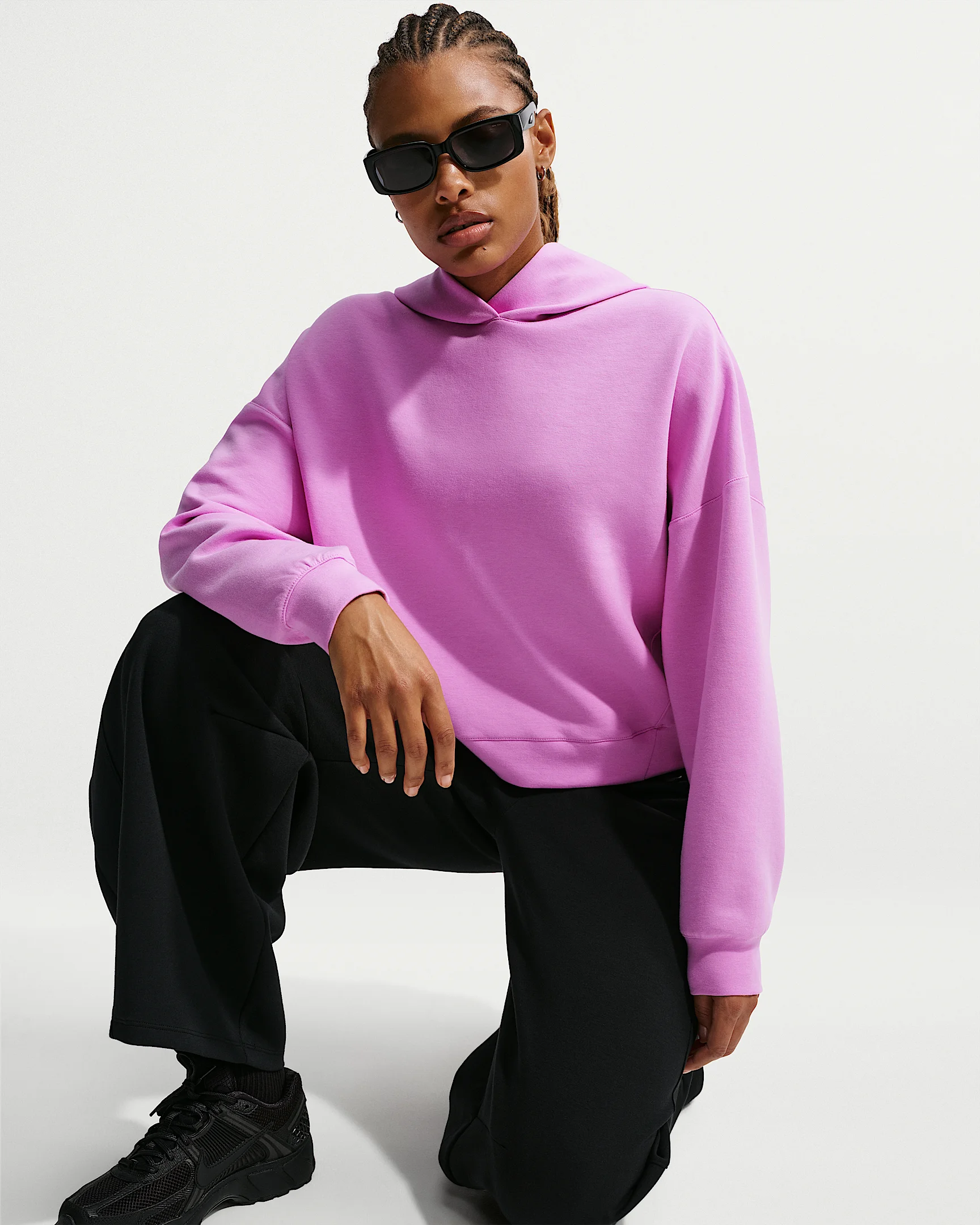 Extraordinarily soft and smooth, our ImpossiblySoft fabric feels made for all-day motion. This spacious hoodie is built with clean lines and sweat-wicking Dri-FIT technology for the ultimate comfort on the go. Benefits - Nike Dri-FIT technology moves sweat away from your skin for quicker evaporation, helping you stay dry and comfortable. - Oversized fit for a spacious feel and easy layering. Product Details - Signature locker loop on back collar - Body: 51% polyester/25% modal/15% cotton/9% spandex; Hood lining: 100% cotton - Machine wash - Imported - Shown: Light Magenta/Black/Desert Berry - Style: IR1929-503 SIZE & FIT Model is wearing size S and is 5′11″179cm Oversized fit: exaggerated and spacious