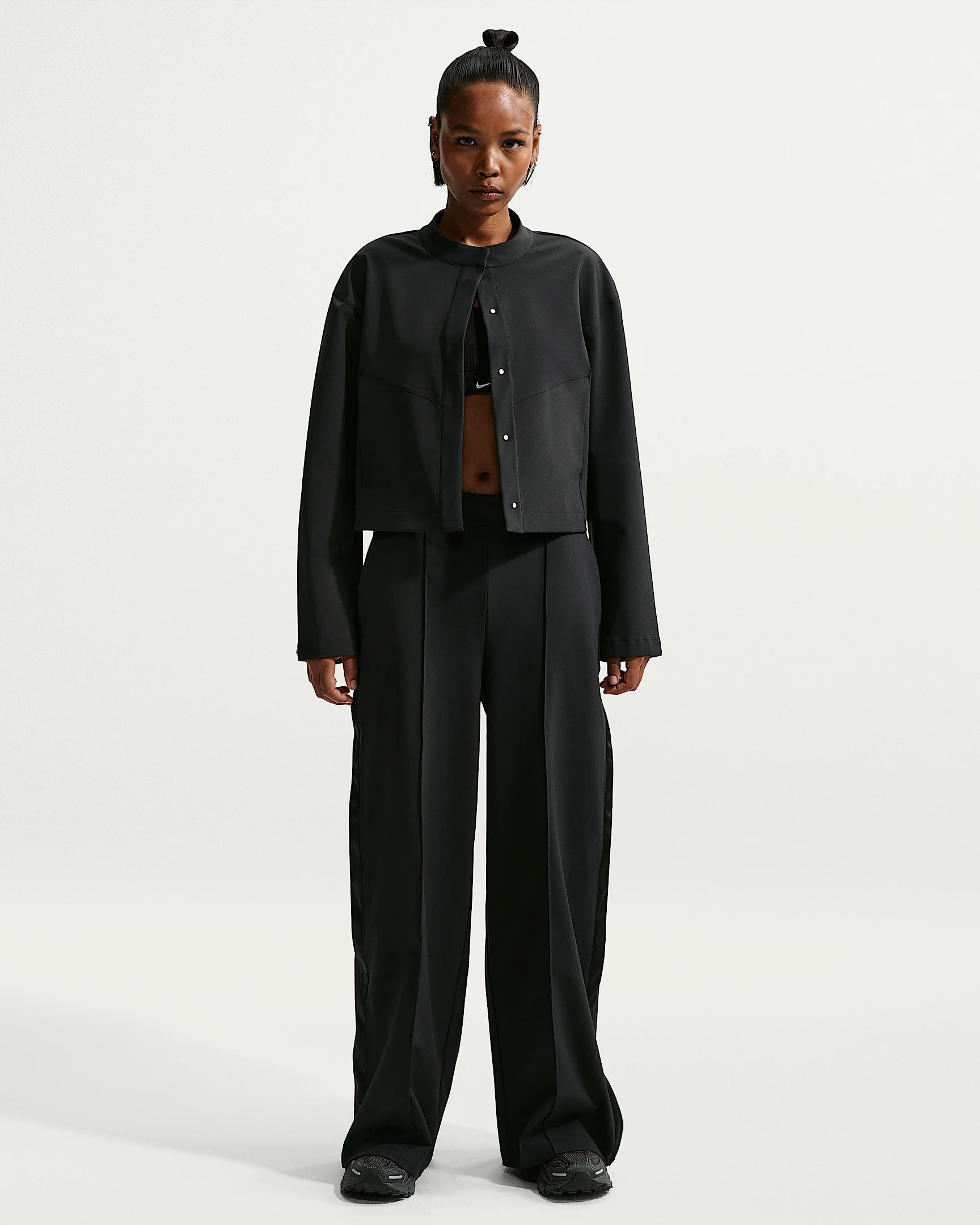 Lightweight and tailored with four-way stretch, our PerfectStretch fabric is designed to keep up with you all day long. With a loose fit and sweat-wicking tech, these tearaway pants give you room to move and comfort that doesn't quit. Benefits - Nike Dri-FIT technology moves sweat away from your skin for quicker evaporation, helping you stay dry and comfortable. - Lightweight and tailored with four-way-stretch, our PerfectStretch fabric is designed to keep up with you all day long. Product Details - Snaps on outside of legs - Signature locker loop on left hip - Elastic waistband with drawcord - Side-seam pockets - 83-88% polyester/12-17% spandex - Material percentages may vary. Check label for actual content. - Machine Wash - Imported - Shown: Black/Black/Dark Smoke Grey - Style: II5323-010 SIZE & FIT Loose fit: roomy and relaxed Fl length: hits below ankle