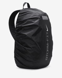 The weather doesn't keep you from practice, and it shouldn't keep you from having dry gear. Whether resting on the ground or hanging on a fence, this backpack handles less-than-ideal game and practice conditions—and holds your ball in the front pocket. The rain fly features Nike Storm-FIT technology to help provide extra coverage from the elements, while mesh on the bag allows breathability and ventilation on those good-weather days. Benefits - Nike Storm-FIT technology resists elements like wind and water to help keep you comfortable in harsh weather conditions. - Side pocket with hook-and-loop closure houses the rain fly. - Enlarged tech pocket provides space for your technology. - Padded shoulder straps are adjustable for a comfortable fit. Product Details - 19"H X 13"W X 7"D - Body: 90% polyester/10% nylon. Lining: 100% polyester. - Elongated zipper pulls - Spot clean - Imported - Shown: Black/Black/White - Style: DV0761-011