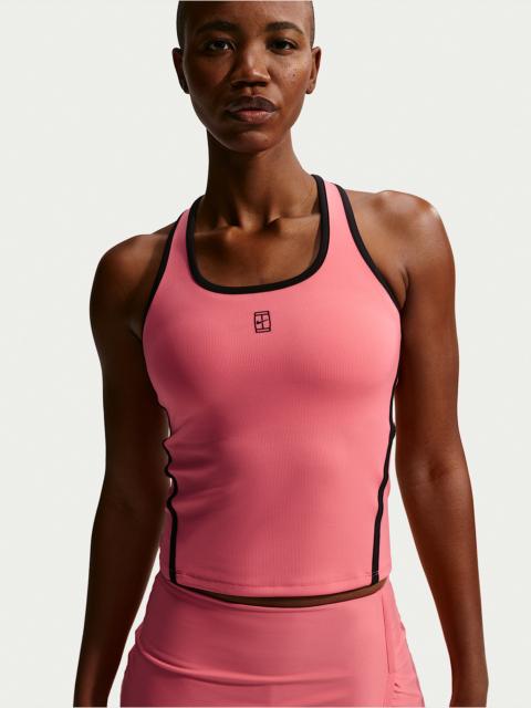 Made with a stretchy, sweat-wicking fabric, this slim-fitting top delivers a vintage look with modern tech to help you stay dry and play your best. Sculpted razor back shape provides coverage without restricting your movement. Benefits - Nike Dri-FIT technology moves sweat away from your skin for quicker evaporation, helping you stay dry and comfortable. - Soft ribbed fabric has optimal stretch for peak performance. - Length allows for easy tucking and provides coverage in your serve. Product Details - Silicone NikeCourt logo - 71% Polyester/29% spandex - Machine Wash - Imported - Shown: White/Black - Style: II3606-100 SIZE & FIT Model is wearing size S and is 5'7"170cm Tight fit: snug and form-fitting