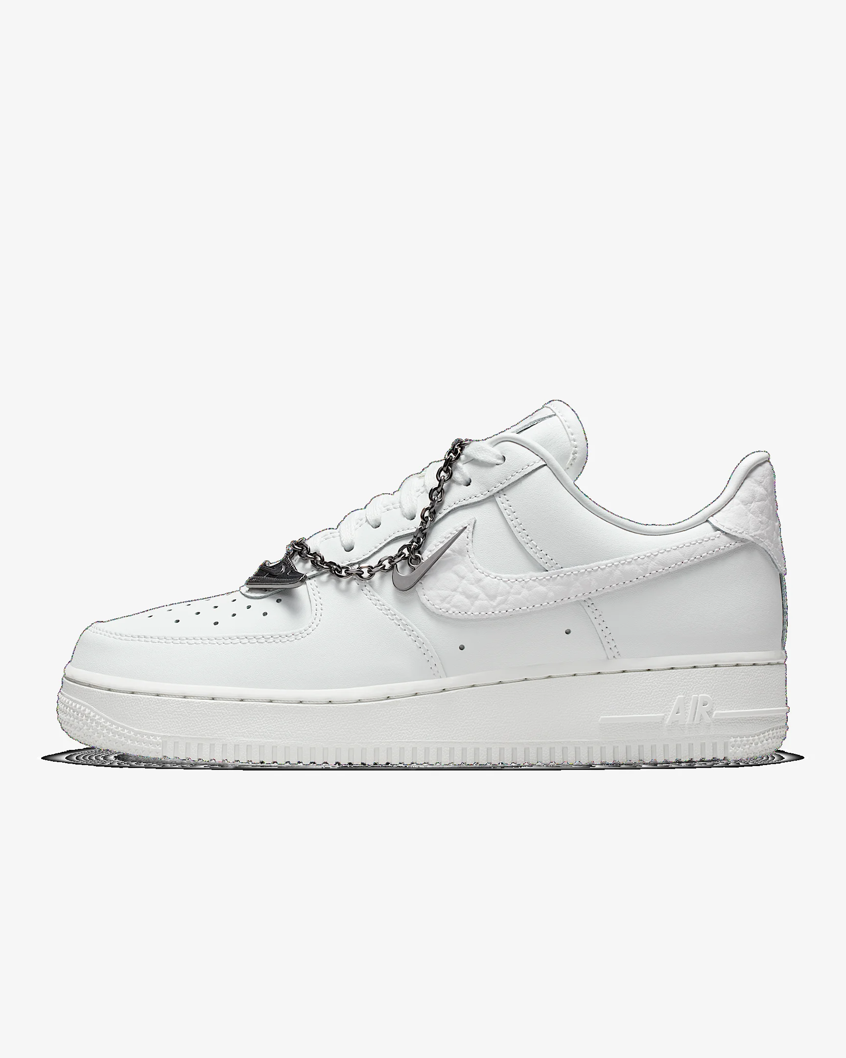 Comfortable, durable and timeless—it’s number one for a reason. The Air Force 1 pairs its classic silhouette with premium leather for a crisp, clean look. This version includes a silver chain and charms to elevate your style. Benefits - Leather upper with perforated toe box is breathable and comfortable. - Nike Air unit provides lightweight cushioning. - Rubber outsole with classic pivot circles delivers traction and durability. Product Details - Low-cut silhouette - Padded collar - Foam midsole - Shown: Summit White/White/Metallic Silver/Summit White - Style: IM6485-121