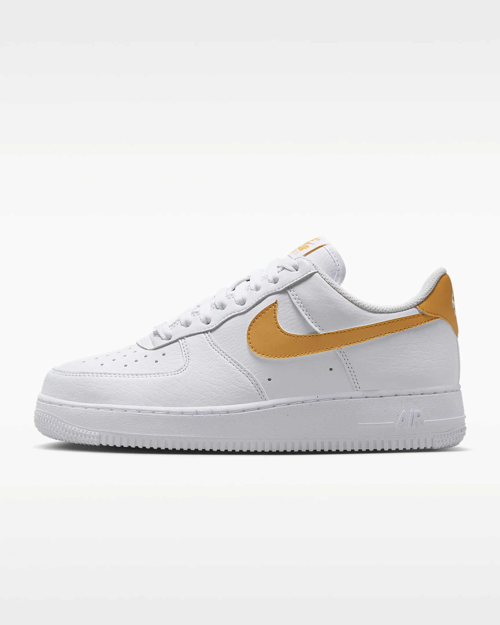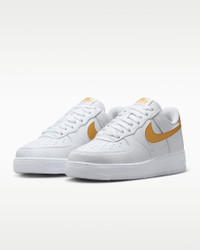 The radiance lives on in the Air Force 1 ’07, the b-ball icon that puts a fresh spin on what you know best: crisp materials, bold colors and the perfect amount of flash to make you shine. Benefits - Upper softens and gains vintage character with wear. - Originally designed for performance hoops, Nike Air cushioning adds lightweight comfort. - Rubber sole with star pattern provides durability and traction. - Padded, low-cut collar looks sleek and feels great. Product Details - Stitched overlays - Foam midsole - Perforations on toe - Shown: White/Metallic Gold - Style: DC9486-114