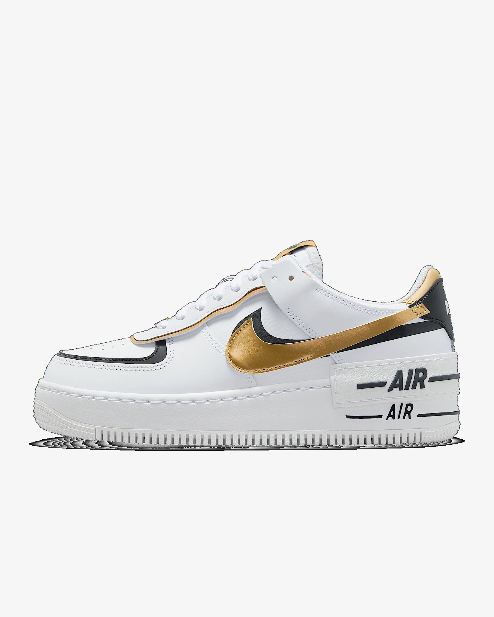 The Nike Air Force 1 Shadow puts a playful twist on a classic b-ball design. Using a layered approach, doubling the branding and exaggerating the midsole, it highlights AF-1 DNA with a bold, new look. Product Details - Midsole height: 41mm - Mix of leather and synthetic materials - Rubber tape - Shown: White/Black/Metallic Gold - Style: CI0919-125