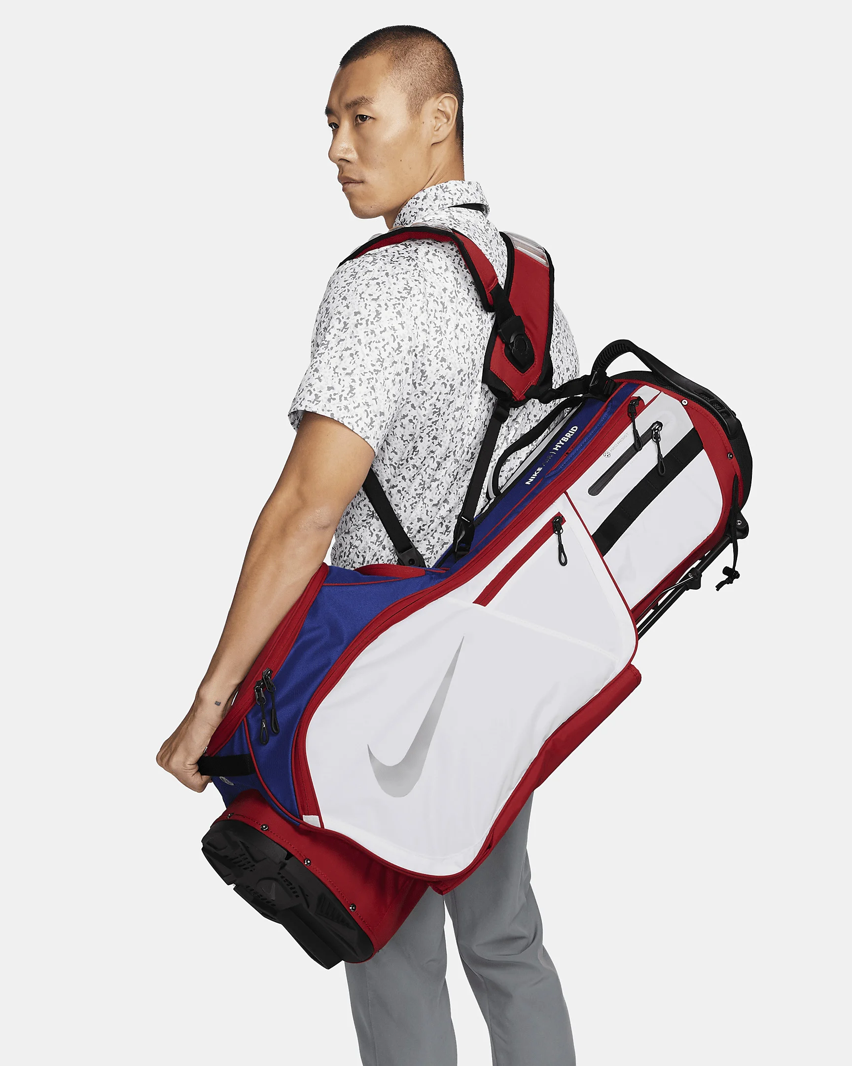 Enjoy the green in ultimate comfort with the Nike Air Hybrid Golf Bag. This durable, lightweight design features a detachable, anatomically correct Nike Equaflex Max Air dual strap for a balanced feel while carrying. If you prefer to ride, a strap-through design makes it easy to secure to the cart. A 14-way divider helps you stay organized while a water-resistant rain hood offers coverage on the course in wet weather. Benefits - Aluminum construction is lightweight and durable. - An insulated pocket helps keep food and beverages cold on hot days. Product Details - 100% polyester - Spot clean - Imported - Shown: Red - Style: N1003478-679