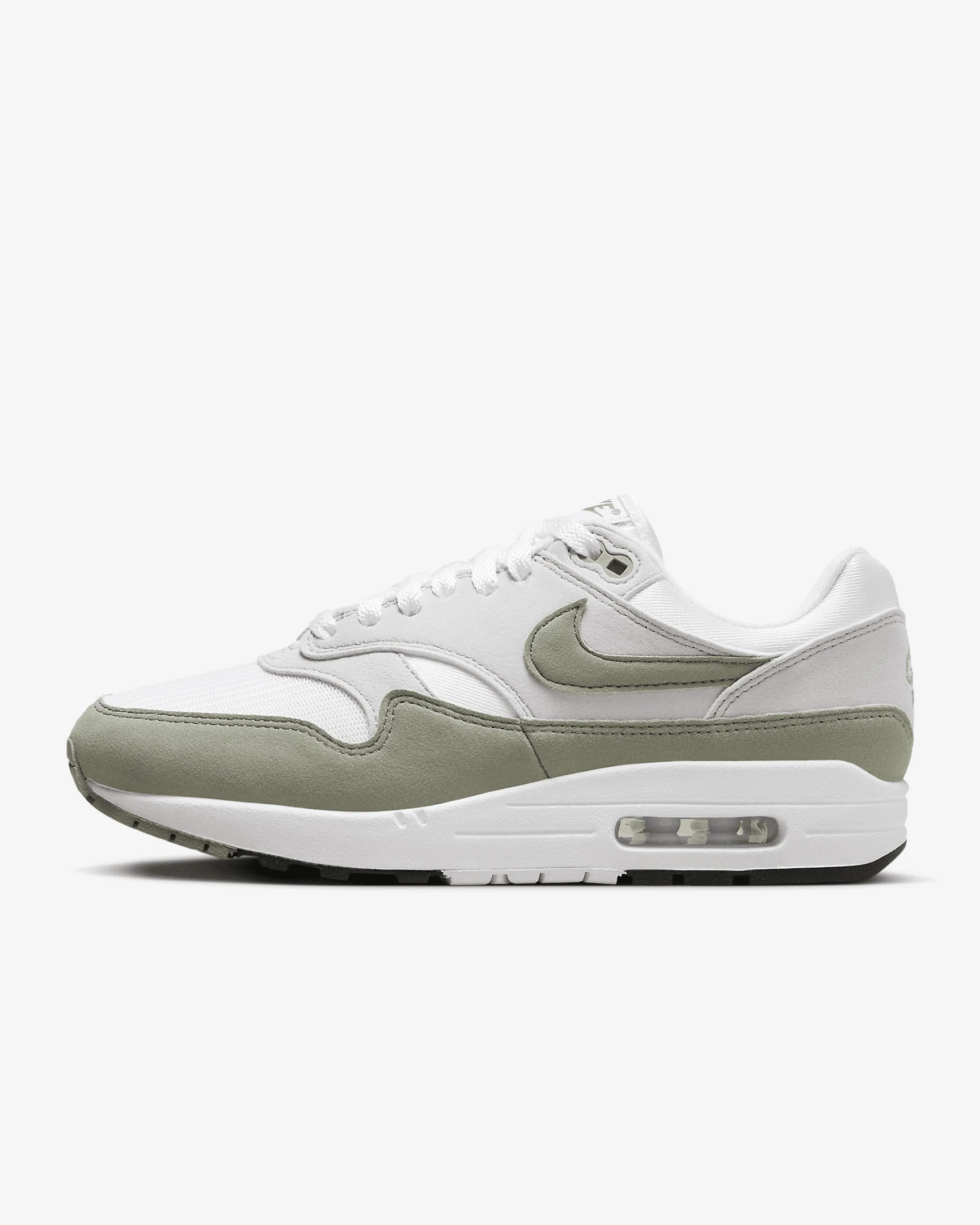 Meet the leader of the pack. Walking on clouds above the noise, the Air Max 1 blends timeless design with cushioned comfort. Sporting a fast-paced look, wavy mudguard and Nike Air, this classic icon hit the scene in ‘87 and continues to be the soul of the franchise today. Benefits - Mixed materials add durability that's made for everyday wear and city life. - Originally designed for performance running, the visible Max Air unit provides all-day cushioning. - Padded, low-cut collar looks sleek and feels comfortable. - Wavy mudguard and pill-shaped Nike Air window keep the classic look you love. - Rubber outsole gives you durable traction. Product Details - Shown: White/Neutral Grey/Black/Light Army - Style: DZ2628-112