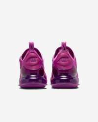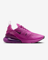 Nike's first lifestyle Air Max brings you style, comfort and big attitude in the Nike Air Max 270. The design draws inspiration from Air Max icons, showcasing Nike's greatest innovation with its large window and fresh array of colors. Benefits - The Max Air 270 unit delivers unrivaled, all-day comfort. - Woven and synthetic fabric on the upper provides a lightweight fit and airy feel. - The foam midsole feels soft and comfortable. - The stretchy inner sleeve and booty-like construction creates a personalized fit. - Rubber on the outsole adds traction and durability. Product Details - Mesh details for an airy feel - Synthetic and textile - Pull tab - Shown: Hot Fuchsia/Beyond Pink/Black - Style: AH6789-501 SIZE & FIT Fits small; we recommend ordering a fl size up