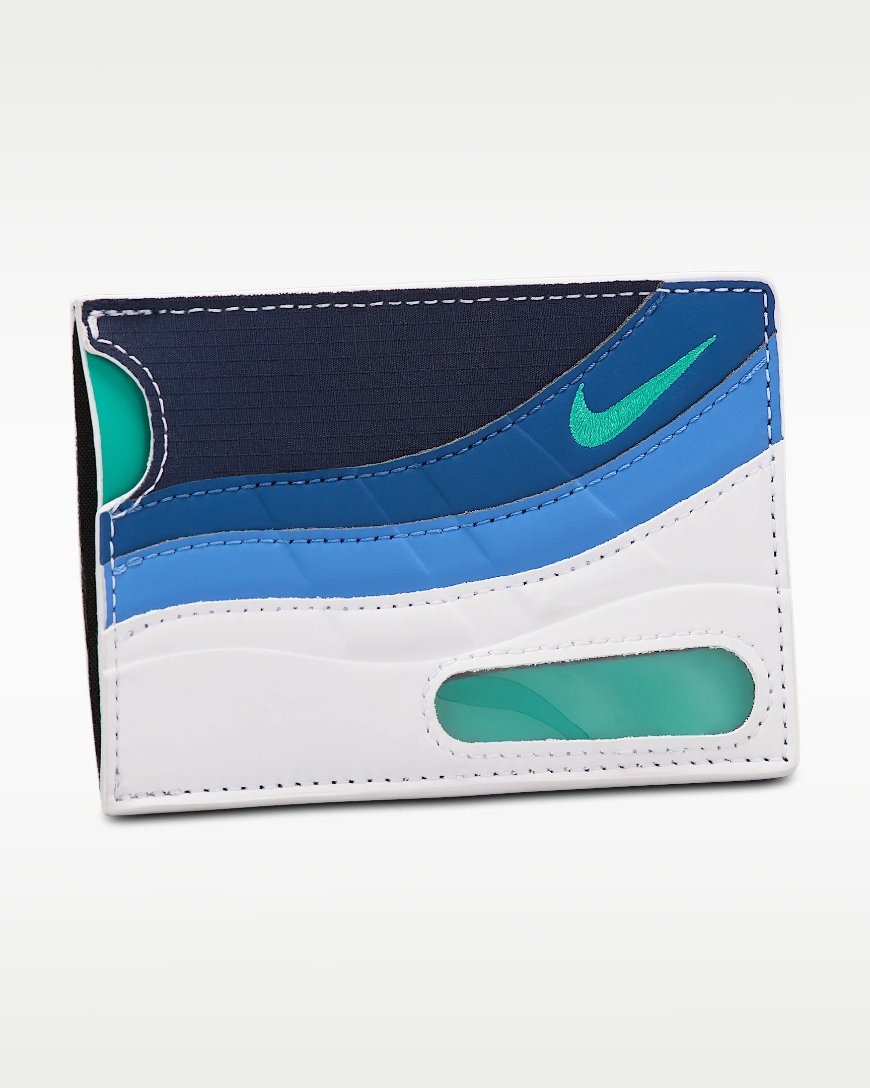 The Nike Air Max 95 Card Wallet pays homage to the iconic '90s shoe that became a sneakerhead staple. It includes two sleeves and three slots for storing your cash, cards and ID. Product Details - Body: 55% polyester/45% polyurethane. Lining: 100% polyester. - Spot clean - Imported - Shown: Obsidian/White/Emerald Green - Style: N1014372-413