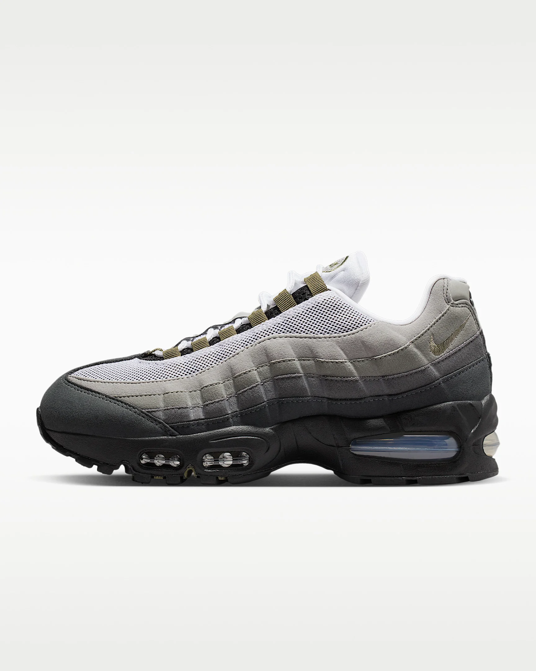 The Air Max 95 originally takes inspiration from the human anatomy, leading to its distinctive wavy design. This version pairs mixed materials and visible Max Air cushioning for a layered look with unbelievable comfort. Benefits - Upper draws inspiration from the human body—the midsole represents the spine, graduated panels are the muscles and the laces are the shoe’s ribs. - Textile and synthetic leather create a layered look built to last. - Visible Max Air cushioning provides lightweight cushioning. - Flex grooves in the midsole/outsole let you move freely. Product Details - Foam midsole - Rubber outsole - Shown: Black/White/Reflect Silver/Medium Olive - Style: HJ5996-003