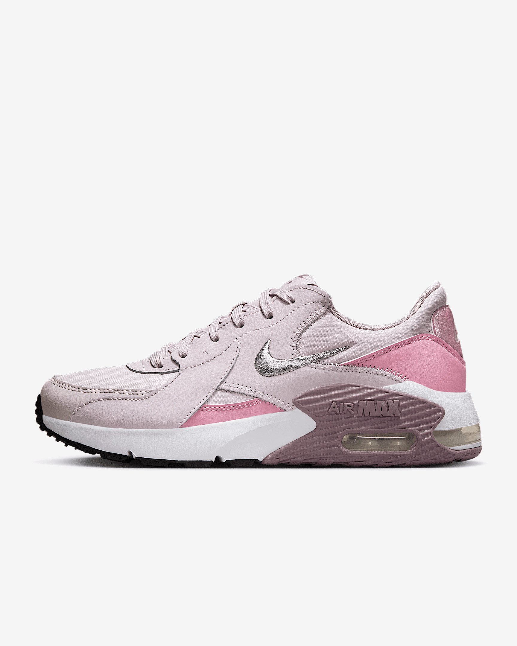 Buoyed to the comfort you've come to trust, the Air Max Excee meets the needs of your 9 to 5 while keeping your outfit on-point with rich textures. These sneakers deliver just what you're looking for—soft cushioning that's easy to style. Benefits - Durable leather and textile upper has metallic accents for a luxe look. - Nike Air cushioning is visible through 3 windows for an updated look. - Rubber outsole with foam pods provides lightweight comfort and durability. - Elongated design lines honor the Air Max 90 while modernizing it. Product Details - Foam midsole - Shown: Platinum Violet/Elemental Pink/White/Taupe Grey - Style: DX0113-001