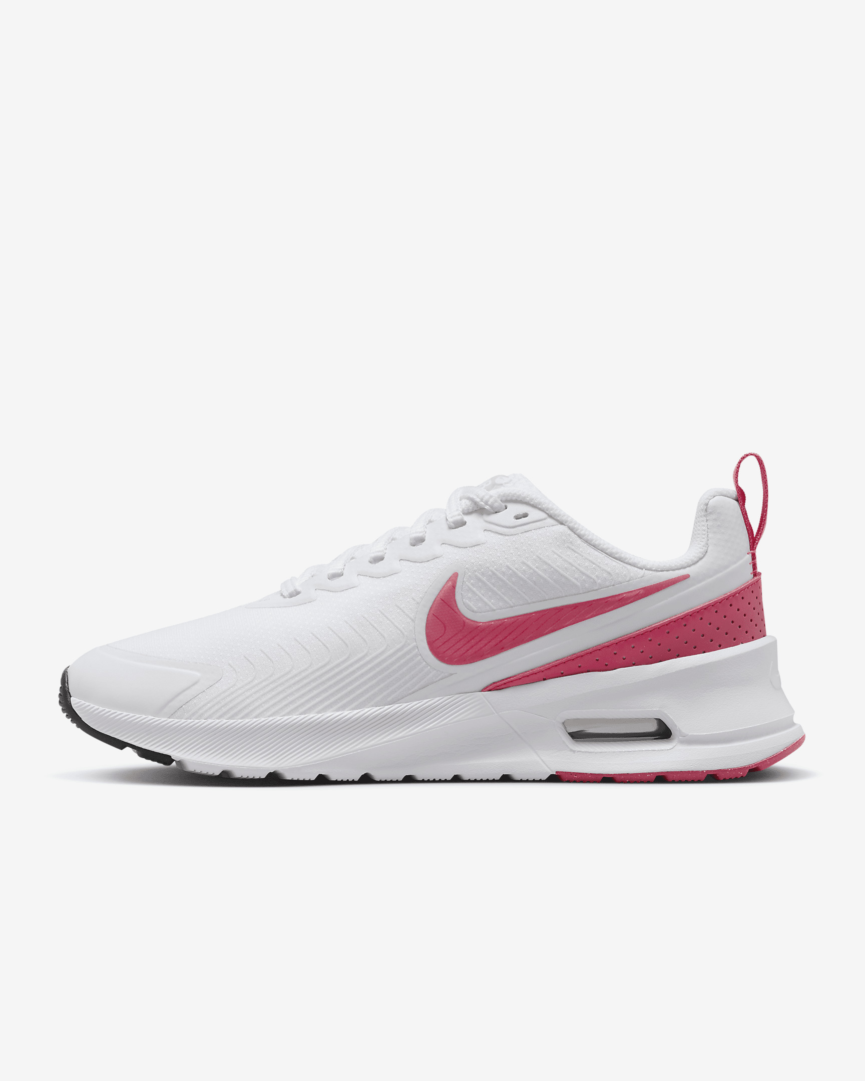 The Air Max Nuaxis is ready for everyday life. You can count on it to look good and feel good too, thanks to breathable mesh and an intuitive Air unit. With design elements inspired by the Air Max 270, the sleek shape makes it the perfect shoe to lace up and go. Benefits - Mesh upper helps keep you cool when life gets busy. - Plush and comfortable, Max Air cushioning has just the right amount of support. - Rubber outsole gives you durable traction. Product Details - Shown: White/Black/Comet Red/Aster Pink - Style: HF1233-100
