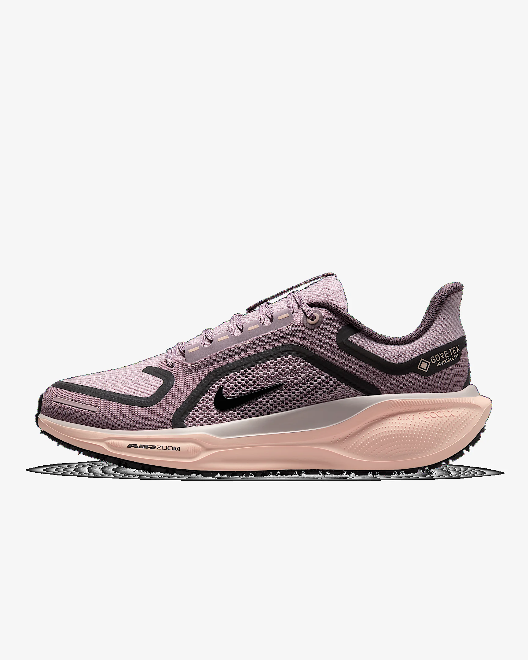 Responsive cushioning in the Pegasus provides an energized ride for wet-weather road running. Experience lighter-weight energy return with dual Air Zoom units and a ReactX foam midsole. Plus, a waterproof GORE-TEX upper and reflective details throughout help you comfortably take on the elements. More Benefits - ReactX foam midsole Product Details - Reflective GORE-TEX logo and Swoosh logo - Reflective graphics and overlays - Not intended for use as Personal Protective Equipment (PPE) - Weight: Approx. 251g/8.9 oz (Women's US 8) - Heel-to-toe drop: 10mm - MR-10 Last - Our best, most consistent fit (same as Pegasus 40) - Plush collar, tongue and sockliner - Shown: Platinum Violet/Crimson Tint/Taupe Grey/Black - Style: FQ1357-004