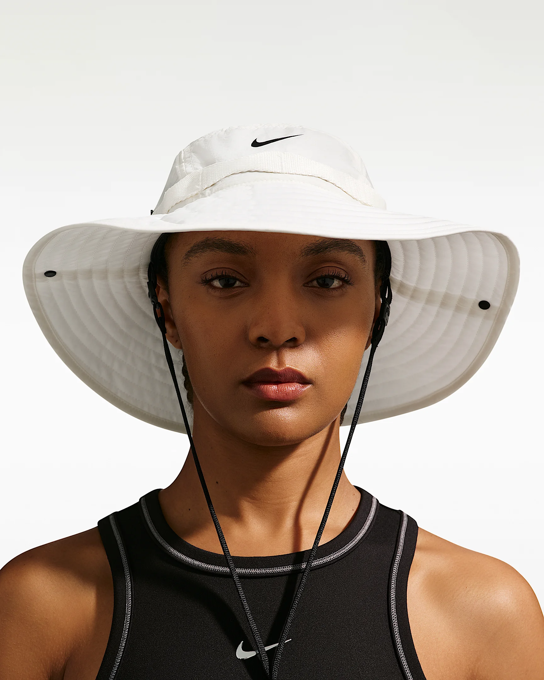 An extra-wide brim gives this mid-depth bucket hat plenty of 360-degree shade around your face and neck. Nike Dri-FIT technology moves sweat away from your skin for quicker evaporation, helping you stay dry and comfortable. Benefits - Apex bucket hats all have a mid depth and 360-degree coverage. - Lightweight and water-repellent fabric provides versatile and durable coverage. - Adjustable drawcord cinches up and down for a custom fit. - Snap buttons on the side give you extra styling options. Product Details - 100% nylon - Do not wash - Imported - Shown: Sail/Anthracite/Black - Style: II0801-133