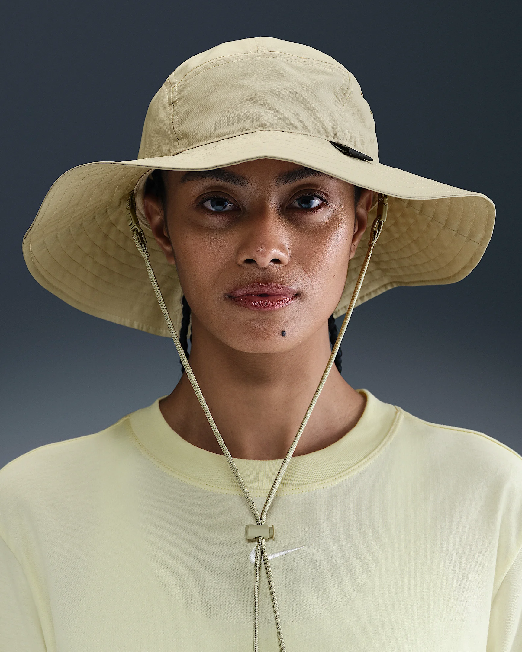 This wide-brimmed bucket hat has a mini stash pocket on the crown and a drawcord to keep it secure when you're on an adventure. Like all Nike Apex hats, it has a mid depth and 360-degree coverage. Product Details - Nike flag label - 70% cotton/30% nylon. - Hand wash - Imported - Shown: Desert Khaki - Style: HJ7135-253