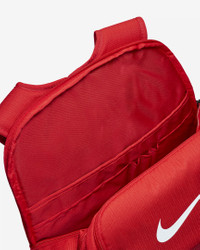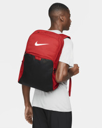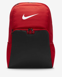 The Nike Brasilia Backpack gives you plenty of organized space to keep your gear in check and ready for your next adventure, even if that's just getting to and from school or the gym. The durable design is made to hold up for everyday use. This product is made with at least 50% recycled polyester fibers. Benefits - Zippered main compartment offers secure storage. - Densely woven polyester stands up to the bumps and scrapes of everyday transport. - Ventilated zip pocket on the front stores used gear away from your other things. - Internal laptop sleeve with organization panel helps keep your computer separate. - Padded, adjustable shoulder straps help you carry the pack comfortably. - Side pockets make it easy to grab water bottles and other items. Product Details - Haul loop at the top - 20"H x 13"W x 7"D - 30L - 100% polyester - Spot clean - Imported - Shown: University Red/Black/White - Style: DM3975-657