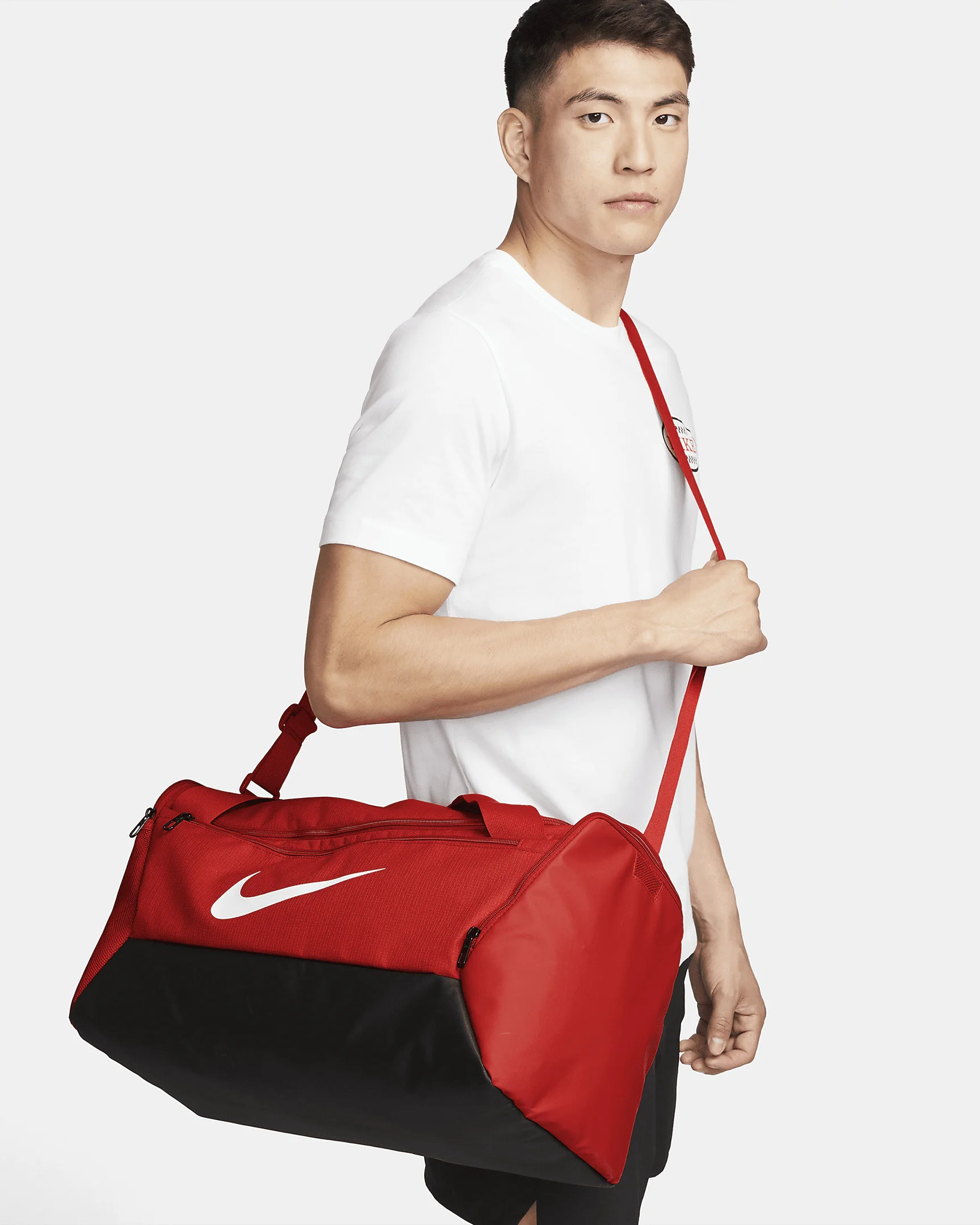 Hit the gym with the duffel bag made to hold all your gear. The ventilated side compartment separates your smelly shoes from your post-sweat-sesh clothes. Get quick access to your phone or keys with the zippered front pocket when you're on the go. Toss it in your locker, next to the power rack and, when you're done, in your car—the coated bottom helps shield your things from bumps, scrapes and spills. Benefits - Spacious zippered main compartment provides easy access to your gear. - Inner zippered pocket stashes your valuables. - Adjustable shoulder strap and dual handles give you comfortable carrying options. - Ventilated side pocket keeps dirty shoes and sweaty clothes separate from your clean gear. - Side pockets hold a water bottle or other small essentials. Product Details - 20"L x 11"W x 11"H - 100% polyester - Spot clean - Imported - Shown: University Red/Black/White - Style: DM3976-657