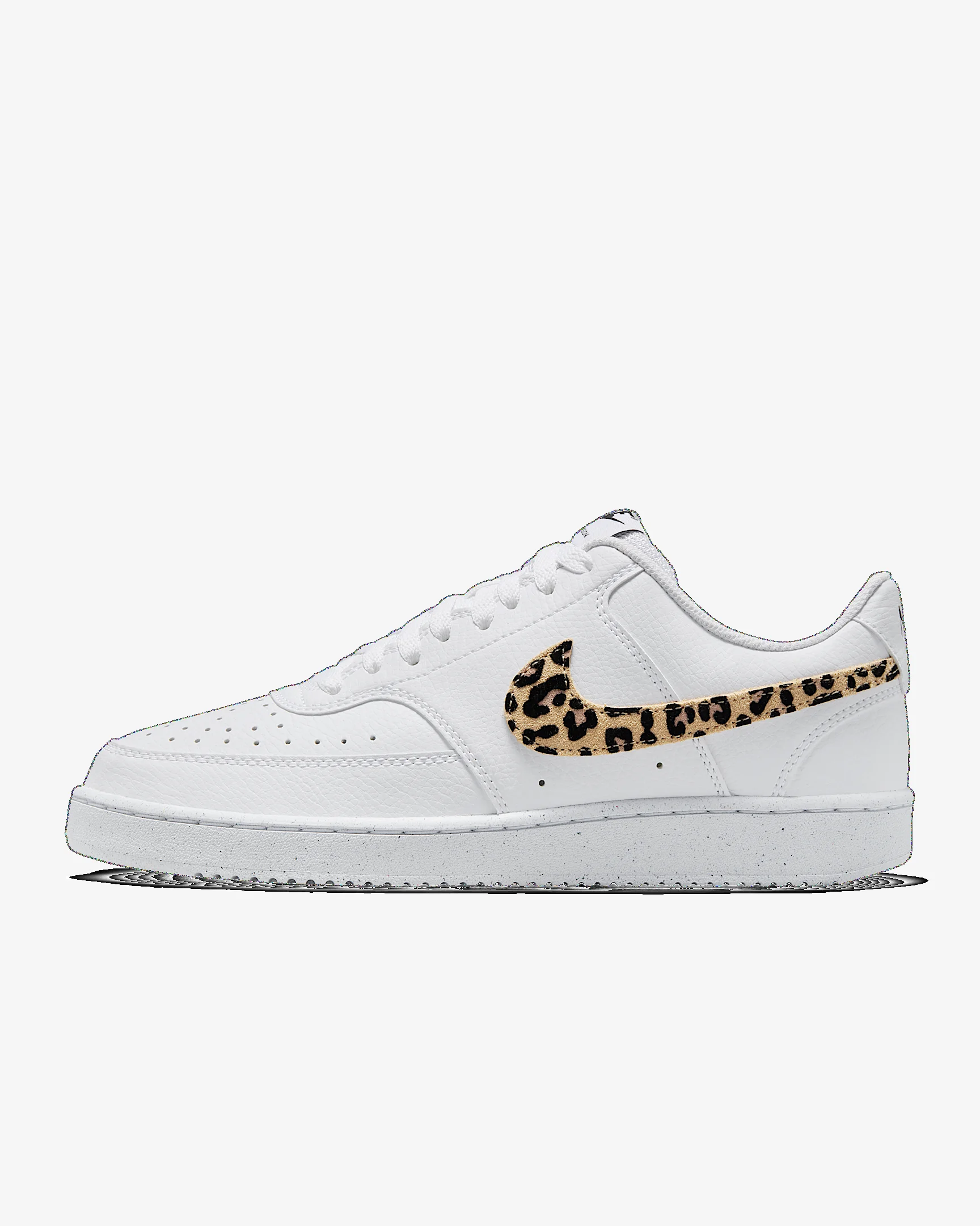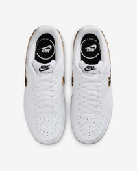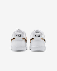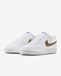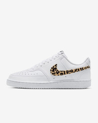 The fastbreak style of '80s basketball meets your everyday with the Nike Court Vision Low. It features an upper inspired by old-school basketball sneakers and the classic rubber cupsole featured on some of the most iconic silhouettes of the past. This version is finished with a suede, leopard-print Swoosh logo for a fierce look. Benefits - Leather upper with perforated toe box is breathable and comfortable. - Rubber cupsole adds durability, support and traction. Product Details - Low-cut silhouette - Padded collar - Shown: White/Black/Multi-Color - Style: IM7646-100