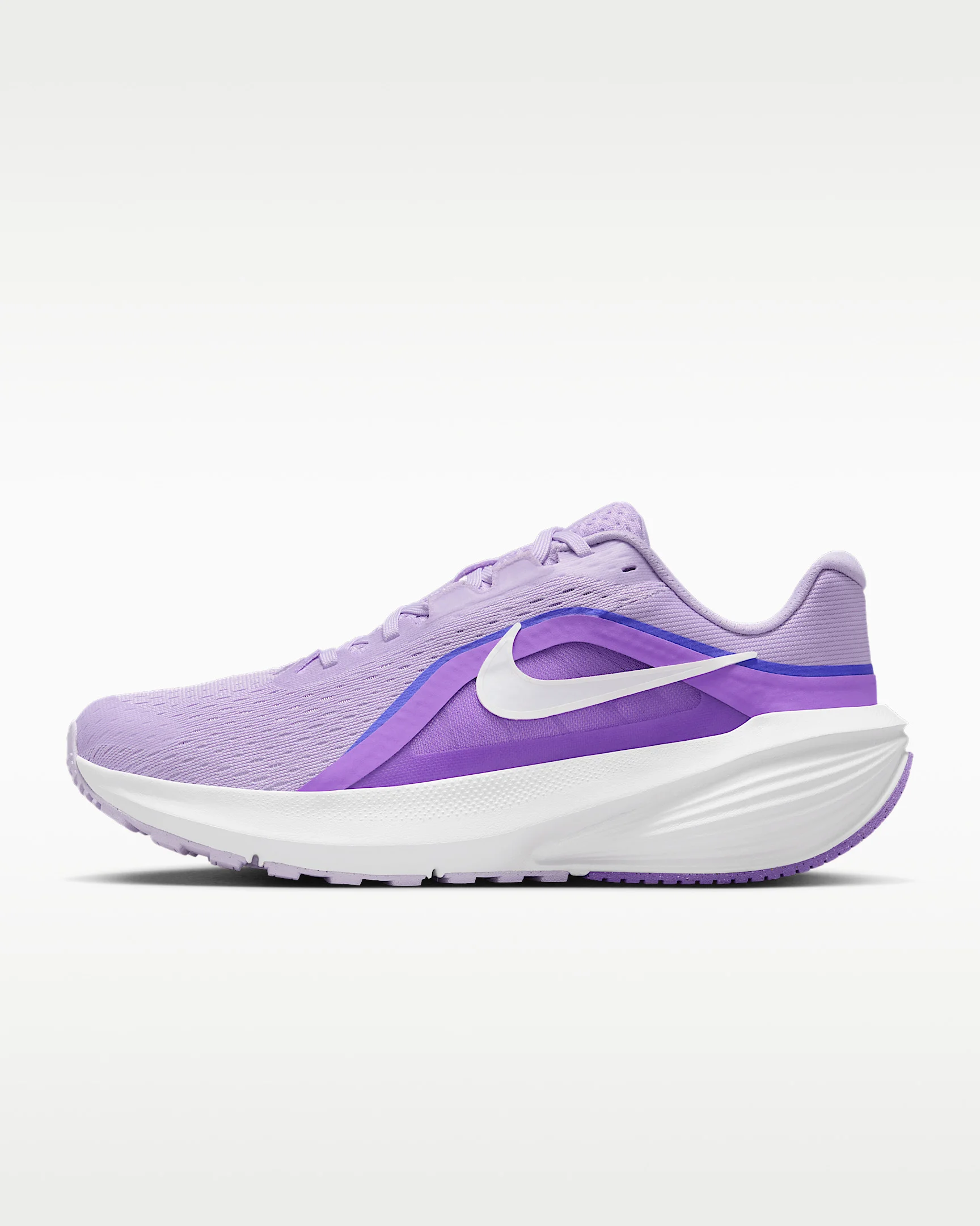 Kick your stride into another gear in the Downshifter 14. We increased the amount of cushioning in the midsole for more comfort and responsiveness than the previous iteration. Plus, the upper is made with an open-hole mesh for optimal breathability and a midfoot band gives you a locked-in feel. Benefits - Engineered open-hole mesh on the upper offers breathability. - We increased the amount of cushioning in the midsole for more comfort and bounce. - Internal fit band offers containment around the midfoot for a locked-in feel. Product Details - Weight Approx.: 276g (Women's US 8) - Heel-to-toe drop: 10mm - Shown: Violet Mist/Sapphire/Bright Violet/White - Style: IB1899-500