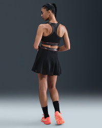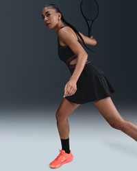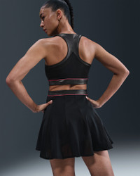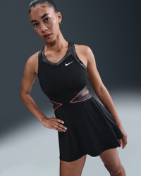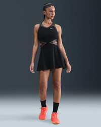 Stand out on the court in this sweat-wicking dress. Its smooth, lightweight fabric and shimmery trim stretch with your every move. Mesh panels and an open-waist design create optimal breathability as the heat rises. Benefits - Nike Dri-FIT technology moves sweat away from your skin for quicker evaporation, helping you stay dry and comfortable. - Mesh panels on the back and the skirt add ventilation. Product Details - Racerback - Body: 83% polyester/17% spandex. Panels: 88% polyester/12% spandex. Mesh: 82% polyester/18% spandex. - Machine Wash - Imported - Shown: Black/Black/Hot Punch - Style: II6186-010 SIZE & FIT Model is wearing size S and is 5′9″175cm Tight fit: snug and form-fitting