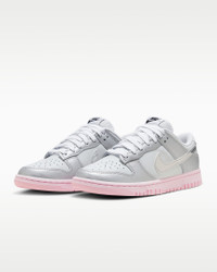 Elevate your 'fit in this Y2K-inspired shoe. Crafted with premium leather, it's the classic Dunk made new again. Metallic overlays deliver the style you expect while a pop of color is the cherry on the bottom. It's your time to shine! Benefits - Real leather upper softens and gains vintage character with wear. - Foam midsole offers lightweight, responsive cushioning. - Rubber outsole with our classic hoops pivot circle adds durability and traction. Product Details - Low-cut collar - Foam insole - Shown: Photon Dust/Pink Foam/Medium Soft Pink/Metallic Silver - Style: HM3698-006