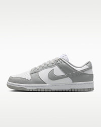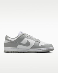 You can always count on a classic. The Dunk Low pairs its iconic color blocking with premium materials and plush padding for game-changing comfort that lasts. The styling possibilities are endless—how will you wear your Dunks? Benefits - Crisp leather upper has a slight sheen and ages to soft perfection. - Foam midsole offers lightweight, responsive cushioning. - Rubber outsole with classic pivot circle adds durable traction and heritage style. Product Details - Padded collar - Perforations on toe box - Shown: White/Light Smoke Grey - Style: DD1873-113 SIZE & FIT Fits large; we recommend ordering a half size down