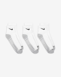 Power through your workout with the Nike Everyday Max Cushioned Socks. The thick terry sole gives you extra comfort for foot drills and lifts while high-friction yarns in the footbed reduce slippage. Benefits - Dri-FIT technology helps keep your feet dry and comfortable. - Thick terry sole delivers comfort and impact cushioning. - High-friction yarn in the footbed helps reduce slippage. - Mesh fabric at the top of the foot offers ventilation. - 1/4-length silhouette provides medial coverage. - Anatomically correct left and right socks are designed for a natural fit. Product Details - 72% polyester/13% nylon/13% cotton/2% spandex - Machine wash - Imported - Shown: White/Wolf Grey/Black - Style: SX5549-100